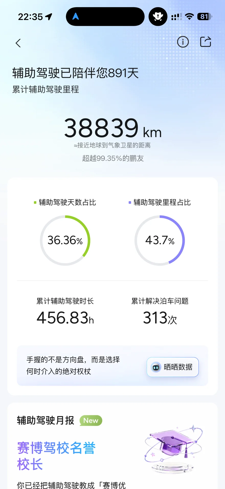 我的G6是755MAX版本,87.5度大电池加上508tops算力的激光雷达智驾,所以,智驾自然也用得多,在提车的891天,近900天里,总里程8万8千公里,智驾就用了38839公里,智驾的时长超过456个小时,超越99.35%的鹏友。