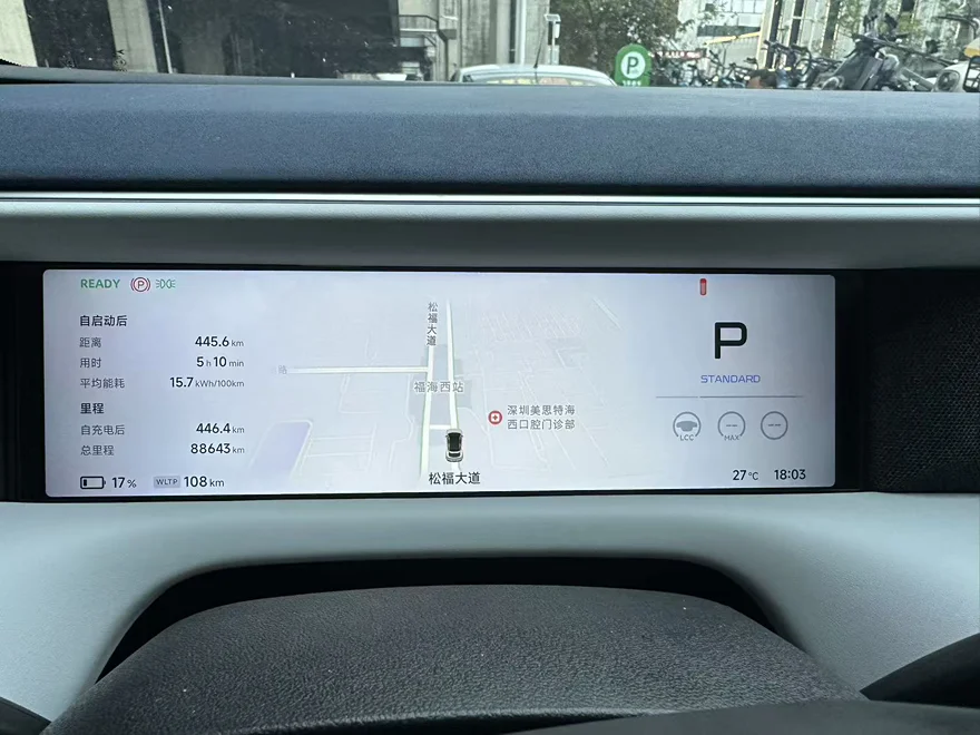 还有一次长途446公里,120速度行驶,中途车一次,只用了5小时10分,WLTP电量还剩108公里。算下来,在WLTP满电630公里,消耗了522公里,续航达成率85%,在满载5人高速120速度的情况下能耗也仅有15.7kWh/100km。