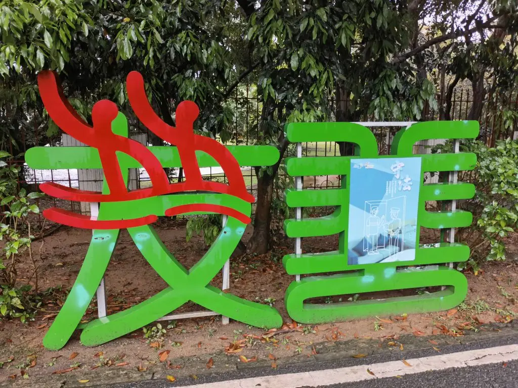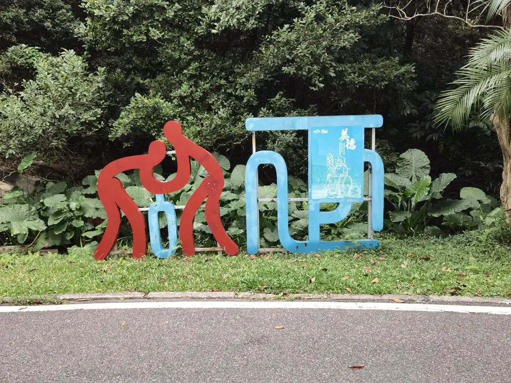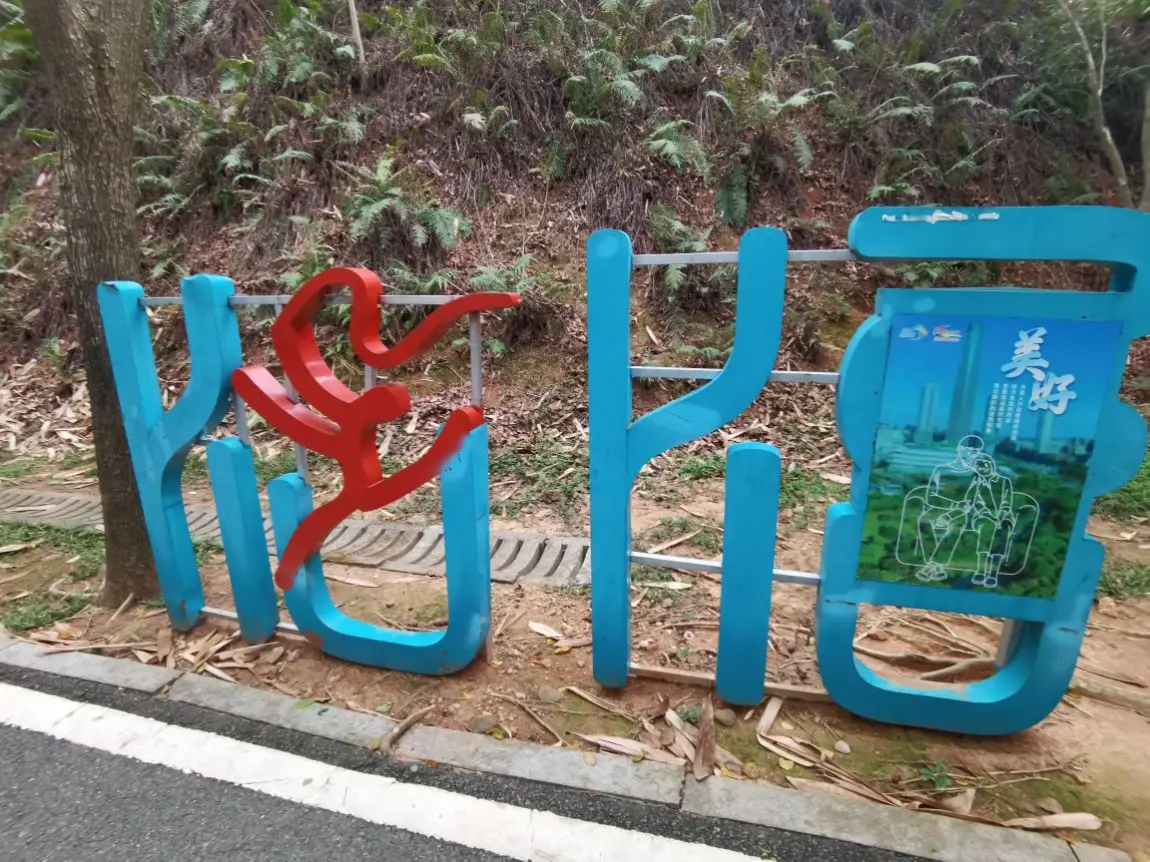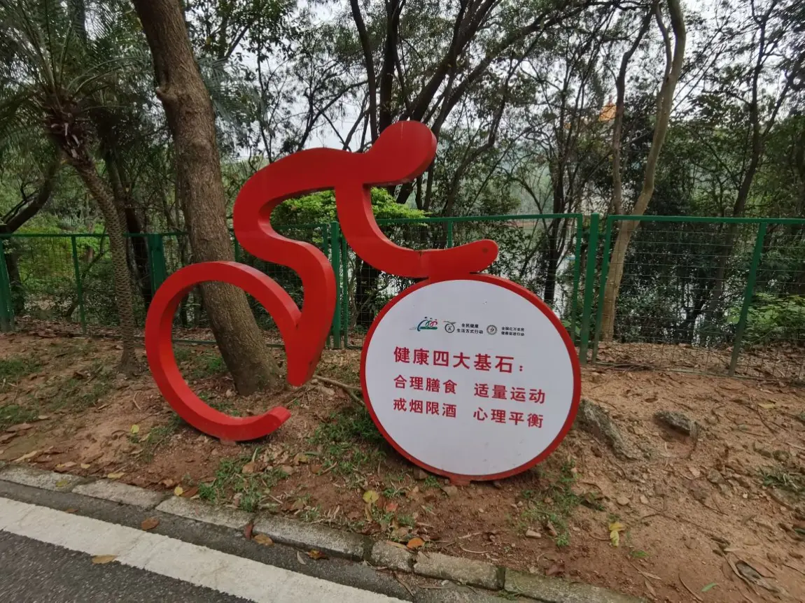 路边的绿植被雨水冲刷得愈发翠绿,空气里满是草木的清香。沿途的公益标语牌成了骑行路上的小风景:“厚德”“守法”“美好”的立体字牌,搭配着温馨的插画,让这段骑行多了几分人文温度;还有那个醒目的红色骑行雕塑,写着“健康四大基石:合理膳食、适量运动、戒烟限酒、心理平衡”,瞬间让这次骑行多了一份健康的仪式感。