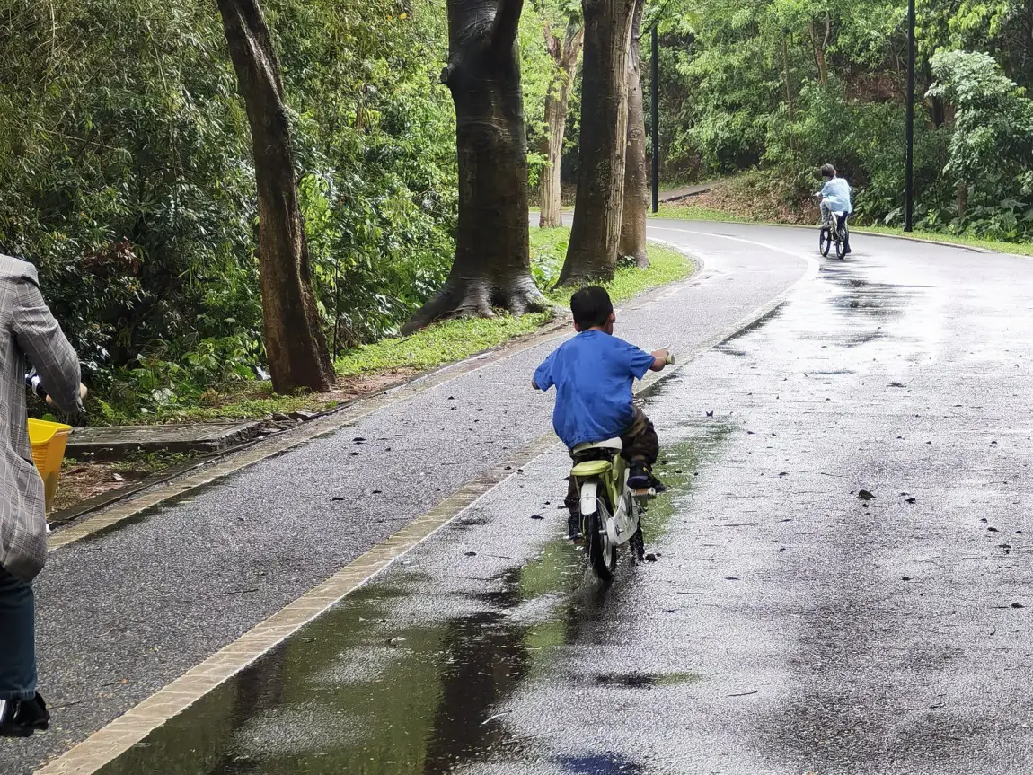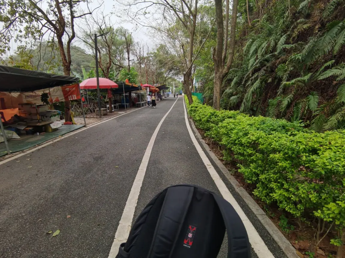 大概半个多小时后,雨势渐渐小了下来,天空也慢慢放晴。我们检查了一下自行车,擦干车座上的雨水,再次出发。雨后的绿道格外清新,路面的积水倒映着路边的绿树,空气里满是负氧离子,每一次呼吸都让人神清气爽。