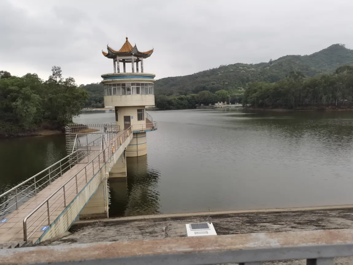 我们沿着绿道一路向前,佛灵湖的湖面在雨中泛起层层涟漪,远处的青山被薄雾笼罩,像一幅晕开的水墨画。湖边那座中式风格的瞭望塔,在雨雾中更显古朴,成了镜头里最美的背景。