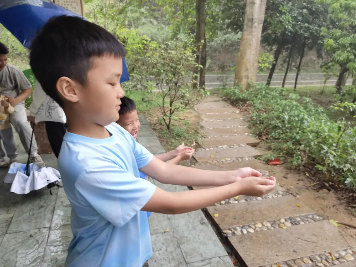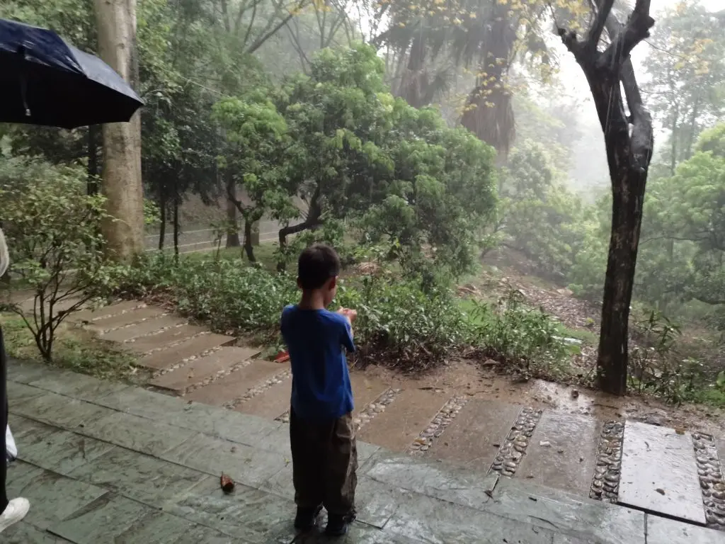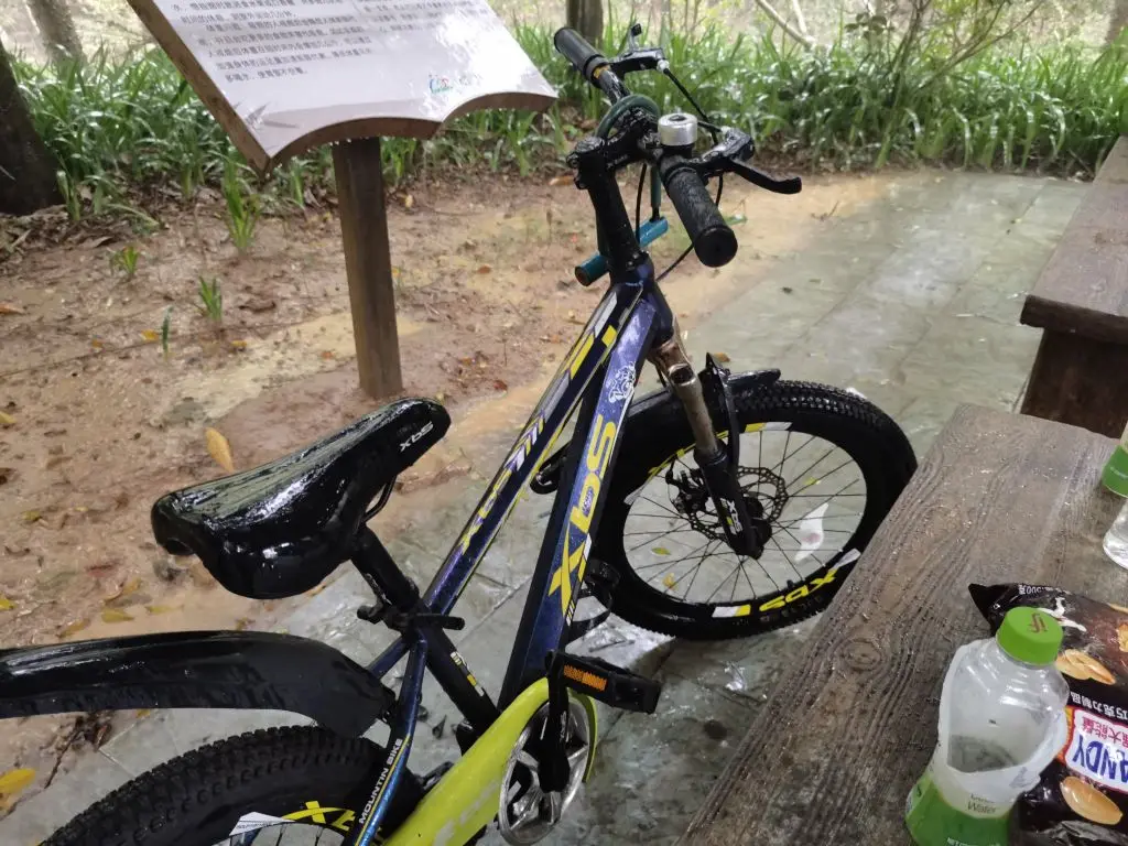 两个孩子兴奋地跑到亭边,伸出小手接雨水,看着雨滴从树叶间滑落,咯咯的笑声在雨里格外清脆。我们把自行车靠在亭边,拿出随身带的零食和水,一边避雨,一边闲聊,看着眼前的雨景,反而觉得格外惬意。