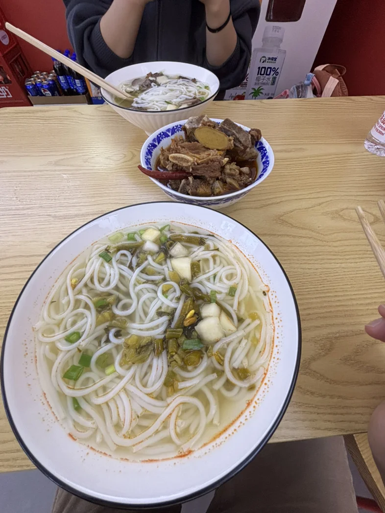 因为是中午一点左右到的,先去吃中饭,据说当地特色牛骨粉,点了一份,感觉也挺一般的,牛骨上的肉少,也嚼不烂,不知道是不是没有选对店的原因,吃完就办理了住宿。因为之前做攻略说景德镇交通不好,十分堵车,就准备去租一辆电动车到处逛逛