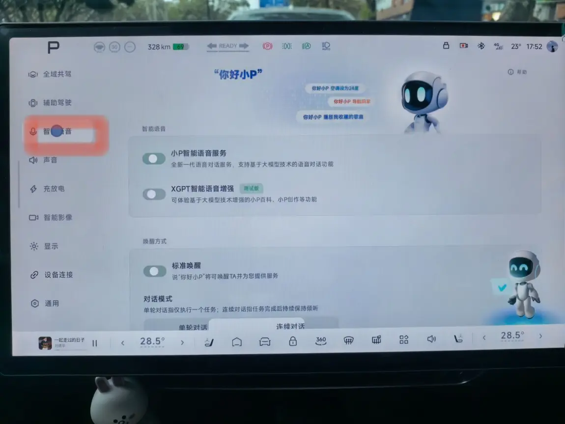 最最重要的还有“可见即可说”功能——尤其在设置界面和音乐界面,屏幕上显示的任何一个选项,直接念出来小P就能选中。选中设置菜单、调整转向助力模式、选中歌单中的第5首歌等等,全程不用伸手戳屏幕,开车时安全很多。
