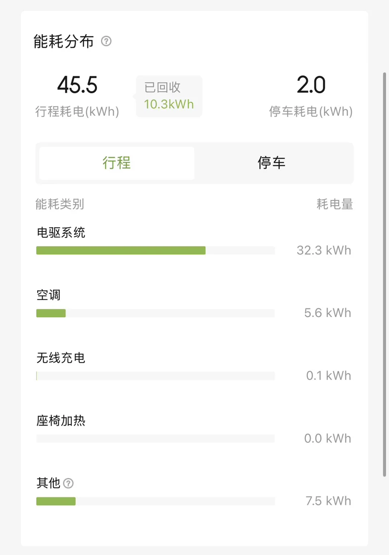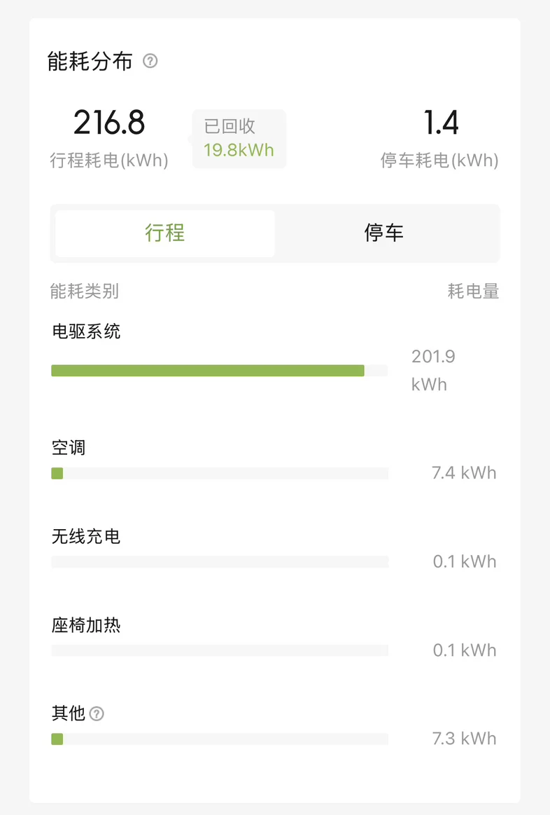 6号那天,216.8度的行程耗电里,光电驱系统就回收了19.8度电!相当于白捡了小20度,这就是下坡路段的快乐!空调全程开着,一天才耗7.4度,无线充电、座椅加热这些杂七杂八的加起来,对能耗影响微乎其微,完全不心疼!