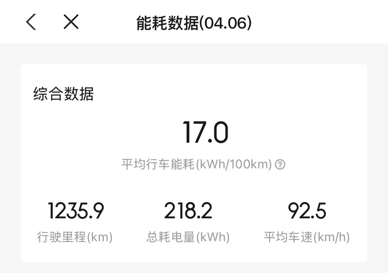 4月6号当天,我从惠州一路干到贵州安龙,全天跑了1235.9公里!总耗电量才218.2度电,算下来平均行车能耗直接干到17.0kWh/100km!平均车速还干到了92.5km/h,全程基本都是高速巡航,这能耗什么概念?我给你们算笔账:1200多公里,就算按家充5毛一度算,电费才100多块钱!比油车省出好几顿饭钱!