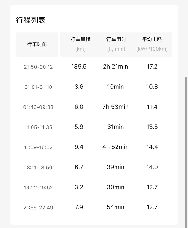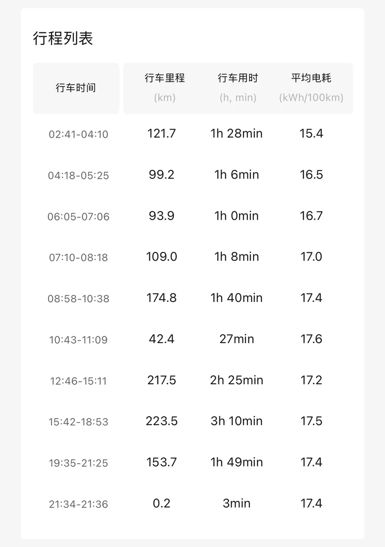 行程列表更直观凌晨2点多从惠州出发的第一段121.7公里,能耗直接干到15.4kWh/100km!后面最长的一段223.5公里高速,能耗也才17.5kWh/100km,全程高速不减速,能耗稳得一批!7号最后那段189.5公里的高速,能耗17.2kWh/100km,就算是市区短途,最低能耗直接干到10.8kWh/100km,这能耗表现,同级别纯电SUV里,我敢说没几个能打的!