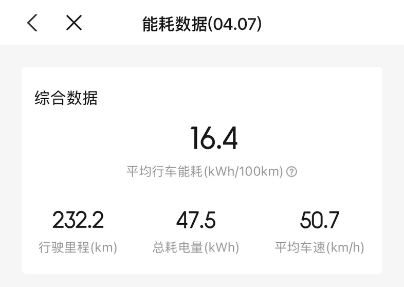 4月7号,从安龙到昆明这最后一段,232.2公里的路程,总耗电才47.5度,平均能耗直接干到16.4kWh/100km!市区+高速综合下来,能耗还能这么低!