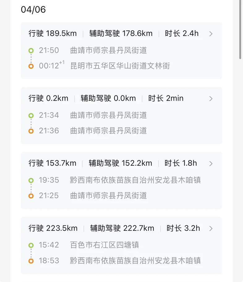 安龙到曲靖153.7公里,辅助驾驶152.2公里!