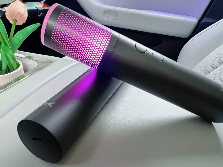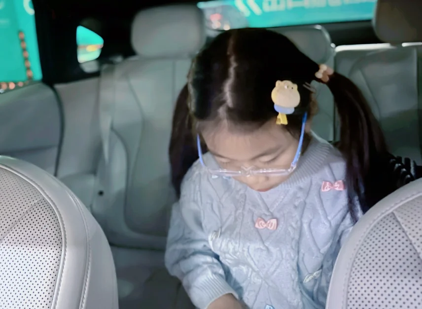 中控大屏上出现K歌界面,小家伙接过小鹏时光麦克风,煞有介事地清清嗓子。车载音响里响起熟悉的伴奏。