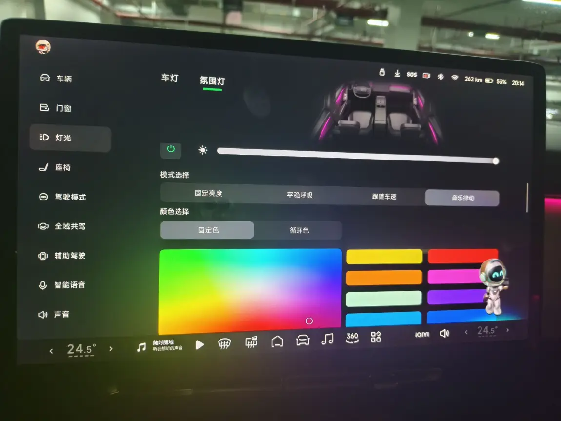 它有四种超实用模式:固定亮度、平稳呼吸、跟随车速、音乐律动🌙我最最推荐的就是音乐律动模式🎶!灯光亮度会跟着歌曲节奏一起跳动、起伏,就像有了生命一样,一整个活起来✨。晚上开在路上,氛围感直接拉满🌃,经常有旁边车的司机忍不住望向我,回头率超高💯!那种被目光追随的小骄傲,真的太爽了~