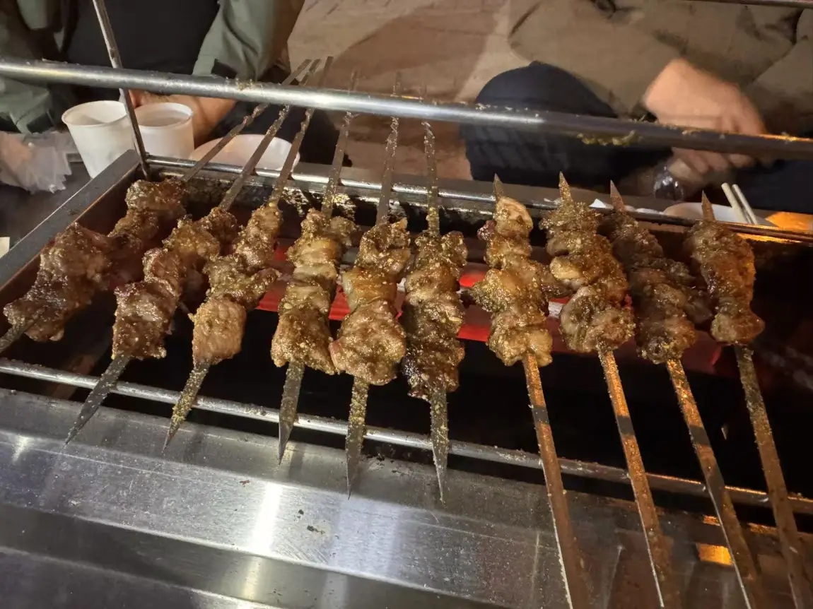最惊艳的是烤油肝。切得薄厚均匀,烤到微微卷边,油脂被逼出来,咬下去外焦里嫩,一点膻味都没有,反而带着一种独特的醇香。撒上孜然辣椒面,用热乎乎的小饼一卷,再塞两根嫩葱,满口喷香。我一口气干了五串。