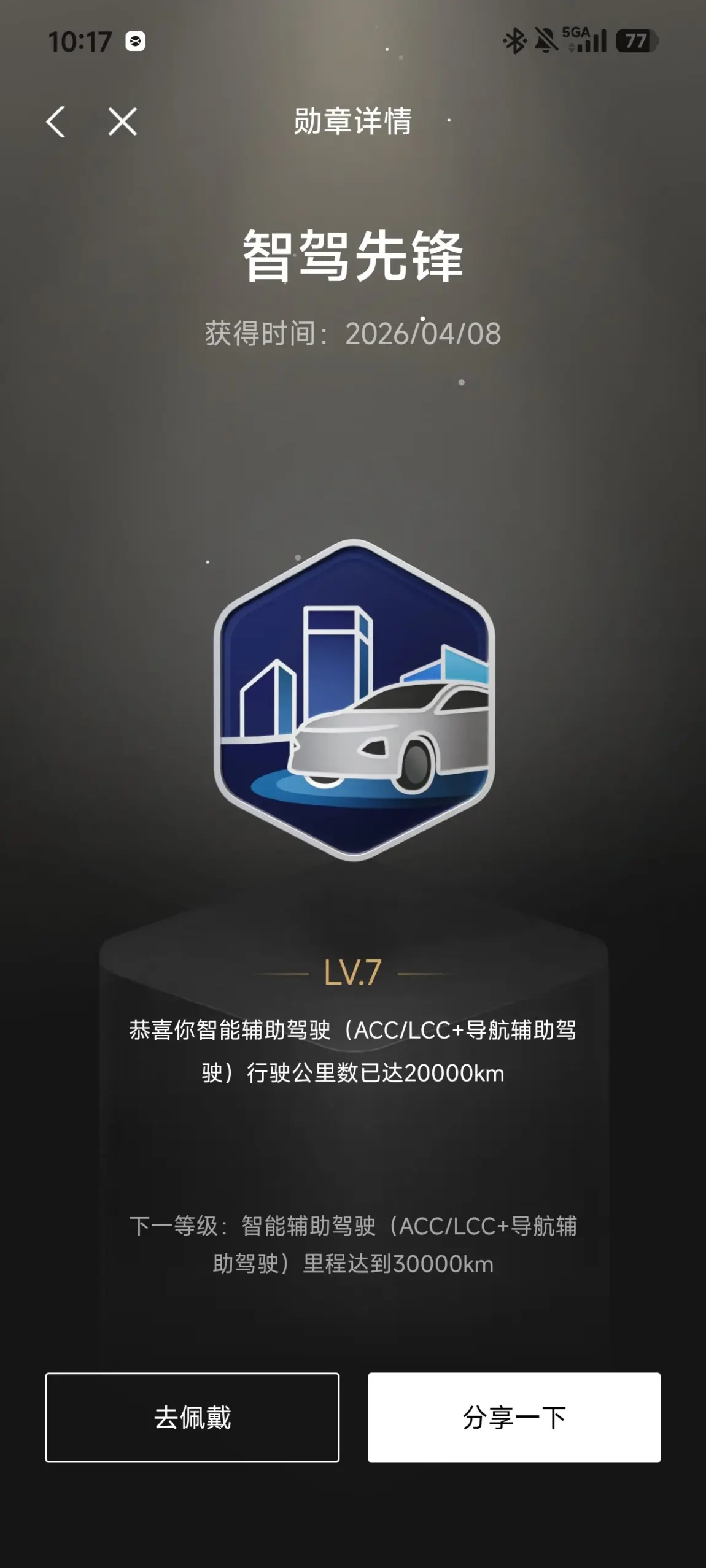 👉👈挚爱勋章:【智驾先锋】,人车一体的默契。17枚勋章中,我最偏爱【智驾先锋】,如今已升级至LV.7,背后是2万公里辅助驾驶的陪伴。从最初试探开启LCC,到如今高速巡航、城市跟车从容自如,2万公里路程里,我与小鹏达成人车合一的默契,成为懂智驾的“老司机”。