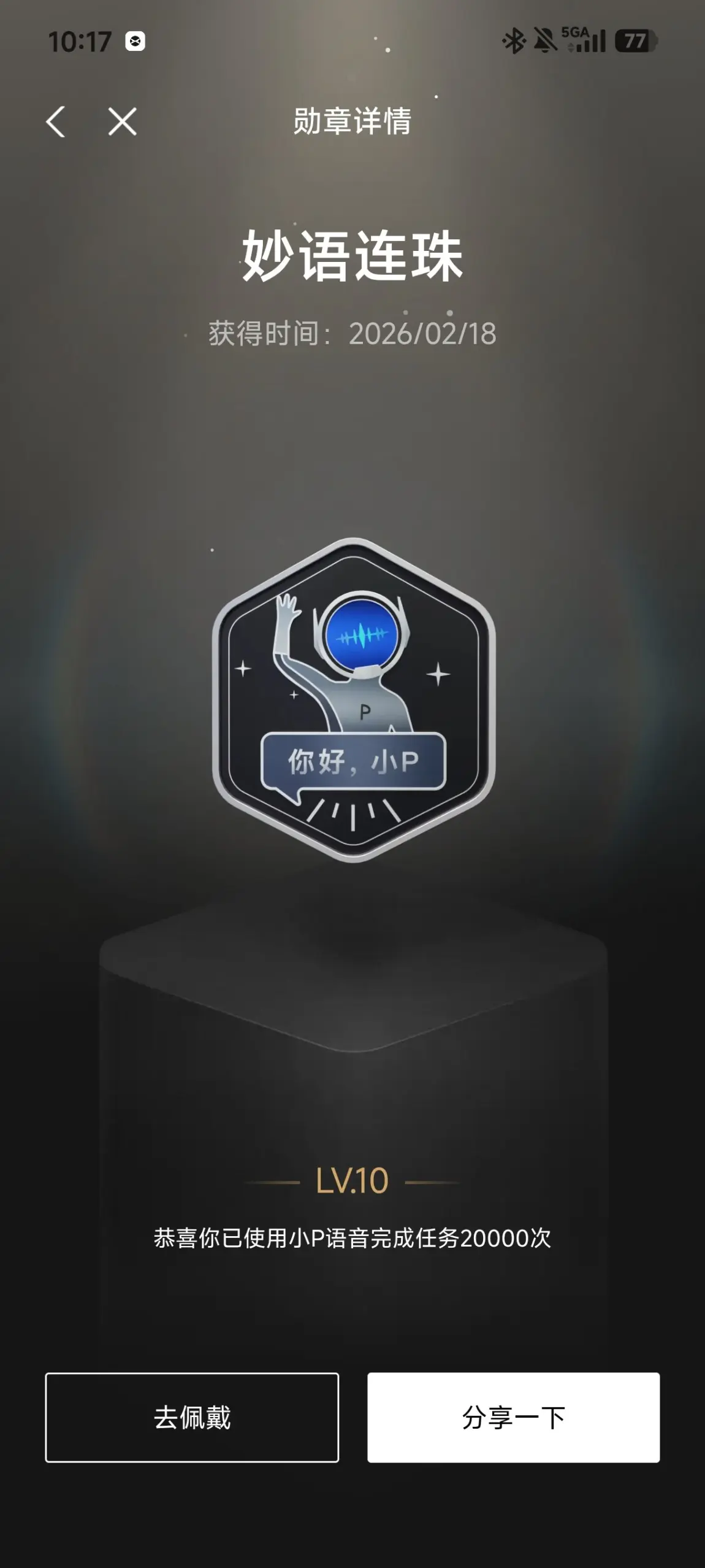 👉👈最快满级:【妙语连珠】,藏着夫妻温情。【妙语连珠】是我最快满级的勋章,功劳全在我家“话痨”老婆。提车后,她上车就和小P互动,导航、放歌、调空调,句句有回应,欢声笑语间,勋章轻松满级,也让科技多了烟火温情。