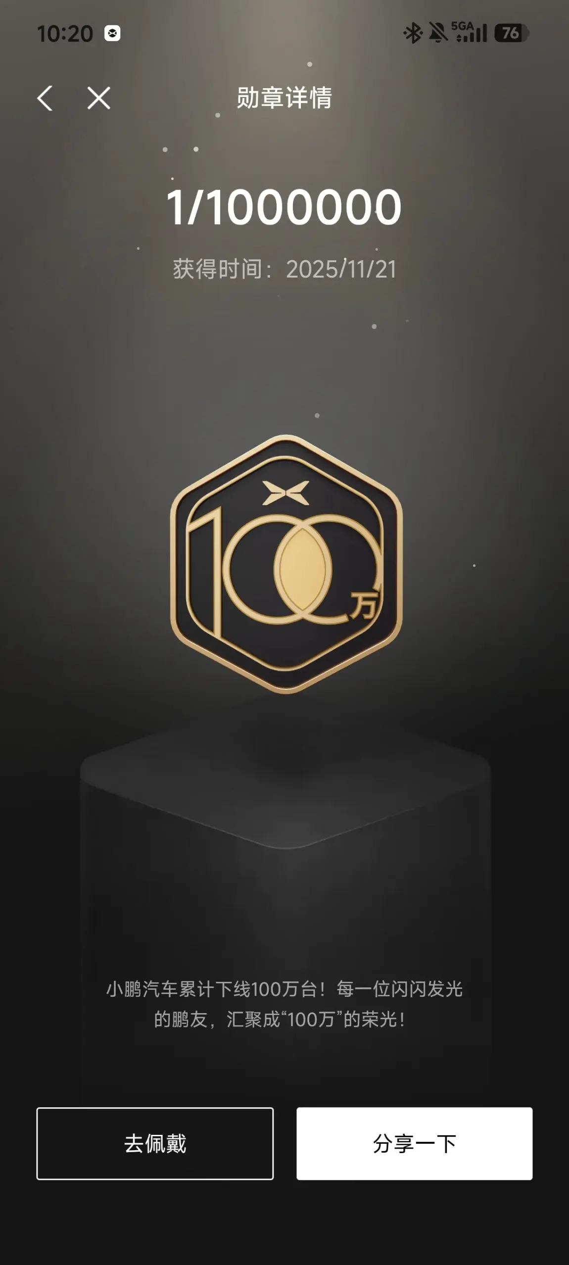 👉👈最盼勋章:【X百万分之一】,共赴成长新程。最让我期待的是【X百万分之一】勋章,我有幸见证小鹏汽车下线100万台,这份荣耀让我倍感归属。从100万到500万,我会继续与小鹏同行,见证每一个里程碑。
