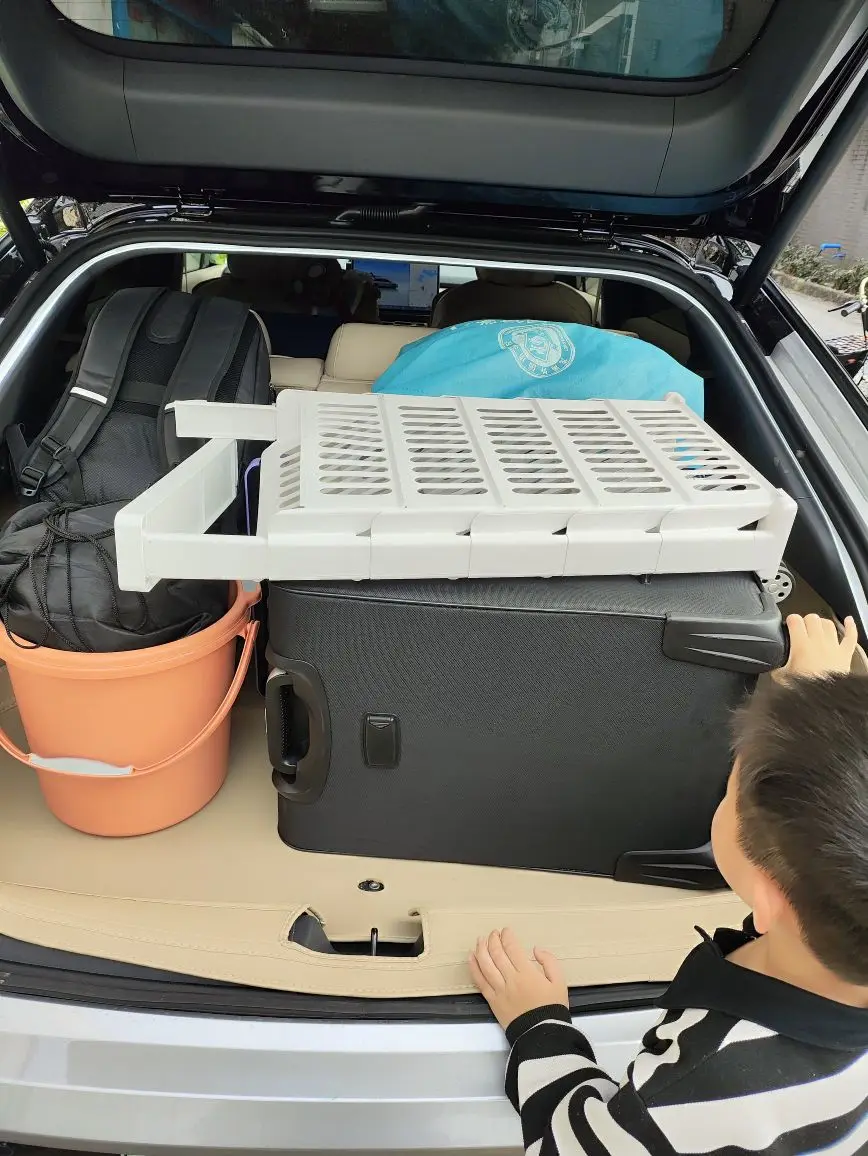 右边则是我的“生活补给站”:一个白色的折叠收纳架,收纳架下面是一个黑色的行李箱,行李箱后面还有一个保温箱。里面常备冰镇饮料和小零食。周末带家人出去玩,或者中午在车里午休时,打开保温箱,来一瓶冰可乐,瞬间满血复活。