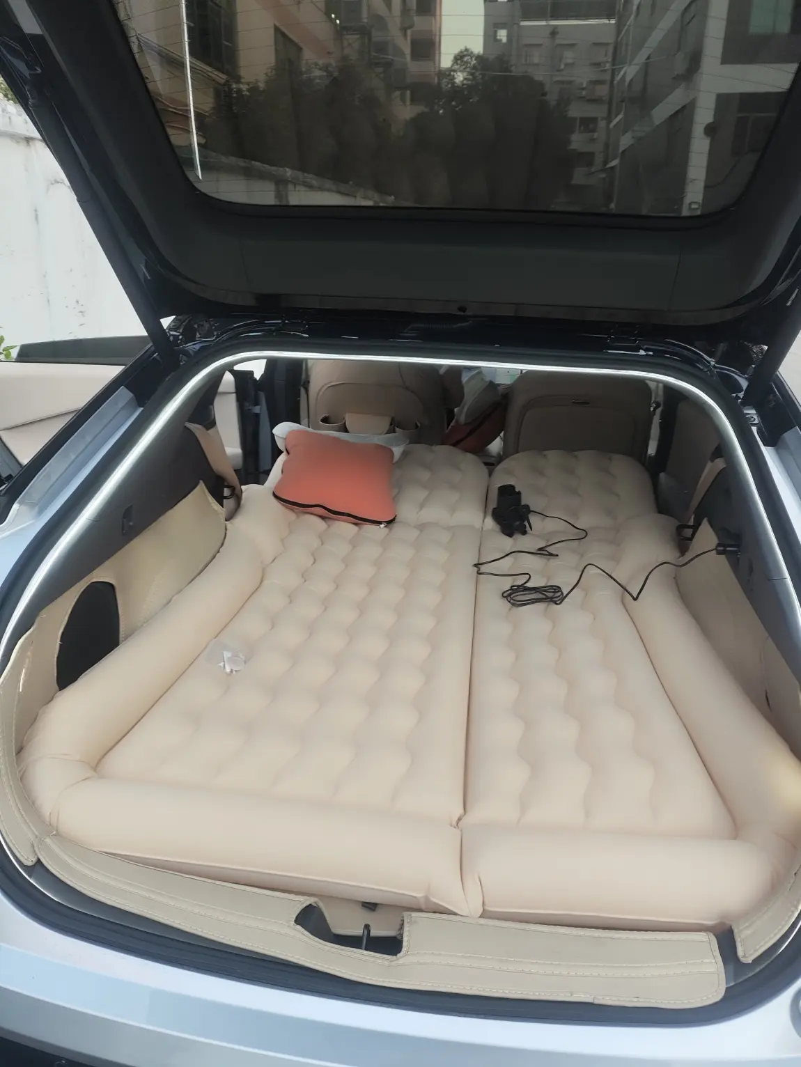 作为一个经常加班的打工人,中午能在车里睡个午觉,简直是奢侈的幸福。小鹏P7+的后排座椅放倒后,空间非常宽敞,铺上充气床,瞬间变成一个舒适的“小床”。充气床是米色的,表面是植绒材质,躺上去软软的,很舒服。床头还有一个小枕头,可以调节高度,满足不同人的需求。