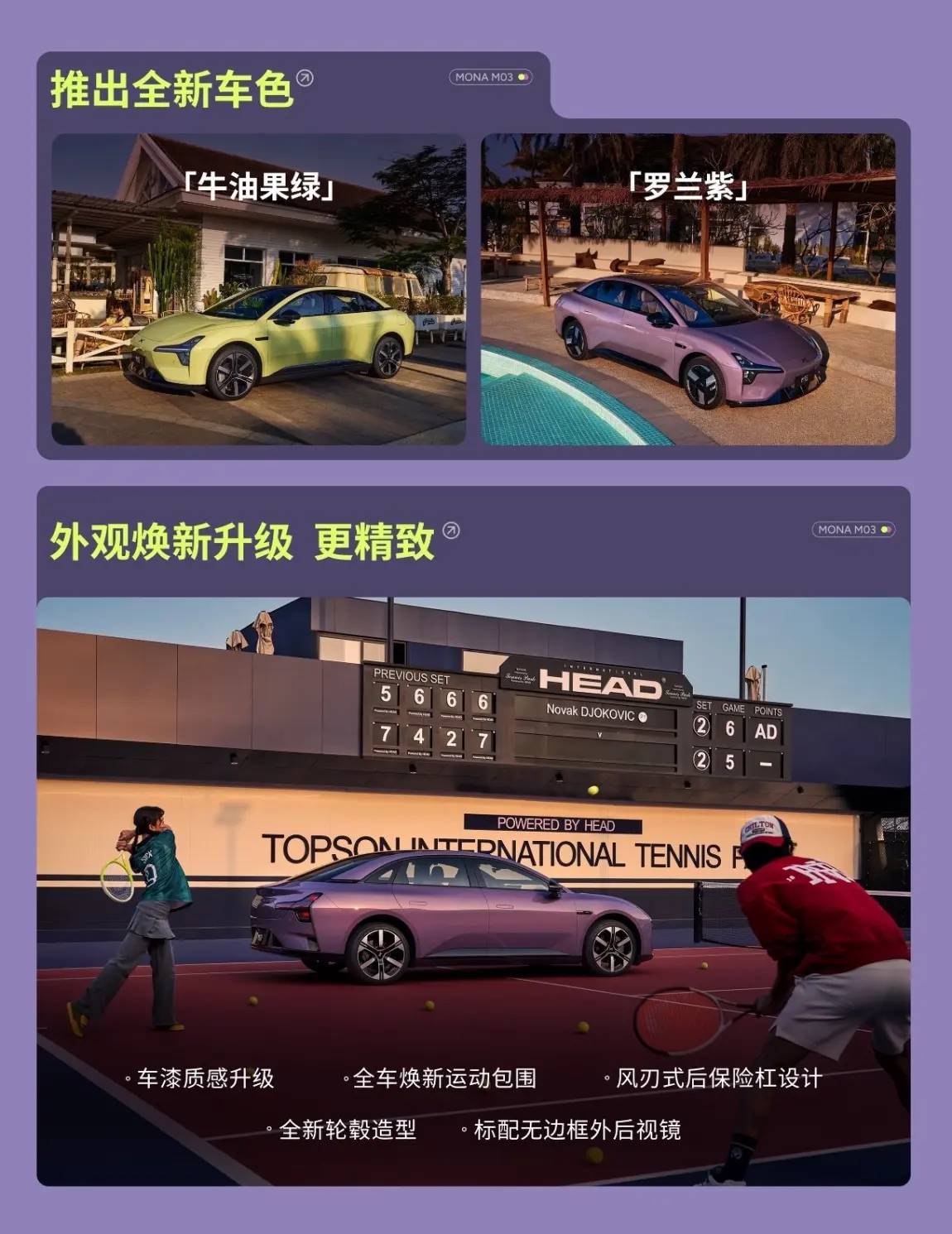 - 新色:罗兰紫、牛油果绿、樱珞粉(车漆更亮)