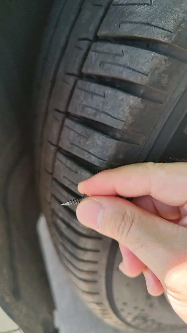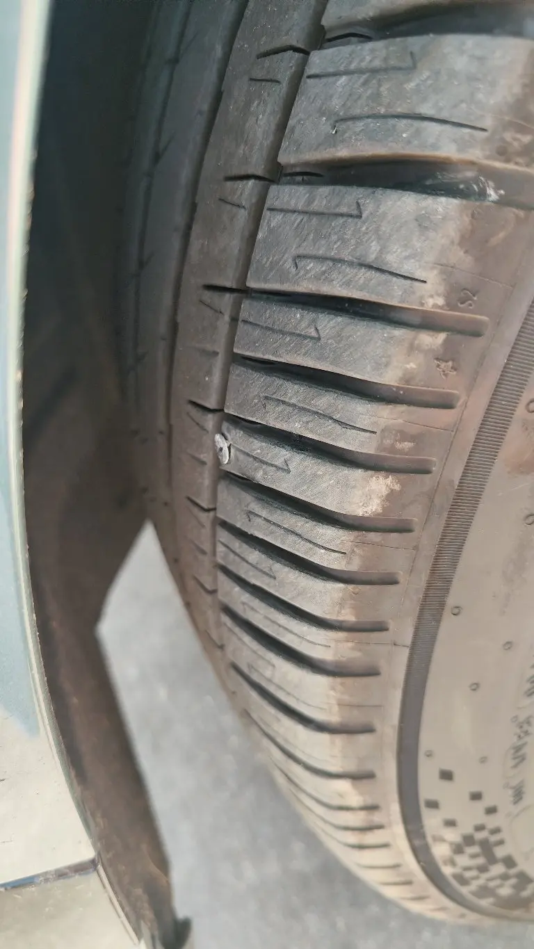 享受完自然风光后,我们就准备回程啦!由于我们停车在不熟悉的户外,而我大多时候都保持着开车前环车一周的习惯,这次还真让我检查到一个问题!轮胎扎钉子了!看着钉子还不小!此时此景,我内心是慌张的,即管我已经是驾龄超10年的老司机,但我也未试过轮胎扎钉子啊!况且电车还没有备胎!瞬间陷入不知如何是好的窘境!幸好查看胎压还在正常范围,还没有降下去!
