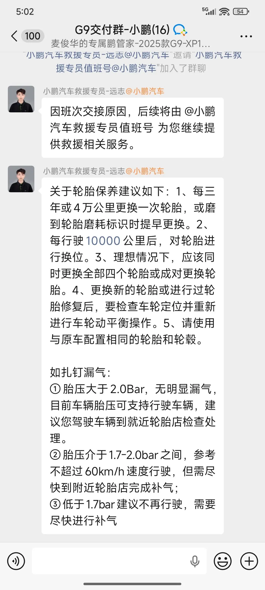 我决定找拖车,把车拖回市区小鹏售后门店再说。于是我在售后群求助,没想到工作人员秒回,耐心询问位置和故障情况,安抚我别着急,马上安排移动服务车上门补胎,但可能需要排队,会不定时跟我同步上门师傅的行程状态!
