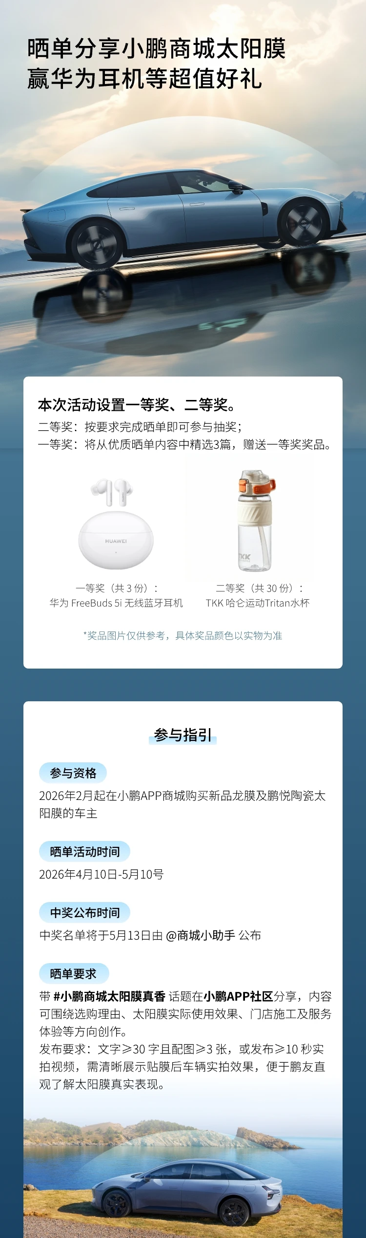 晒单分享小鹏商城太阳膜,赢华为耳机等超值好礼