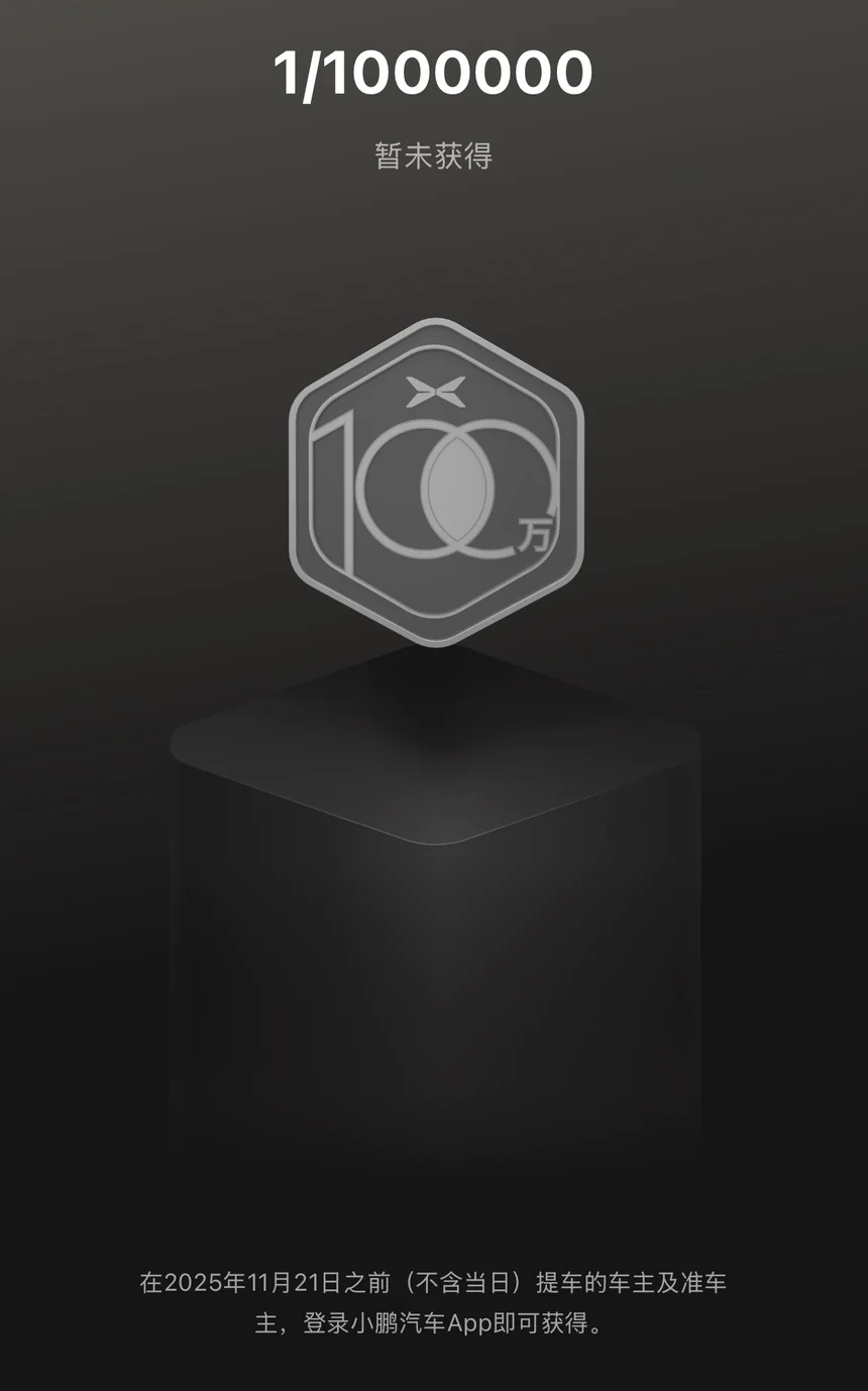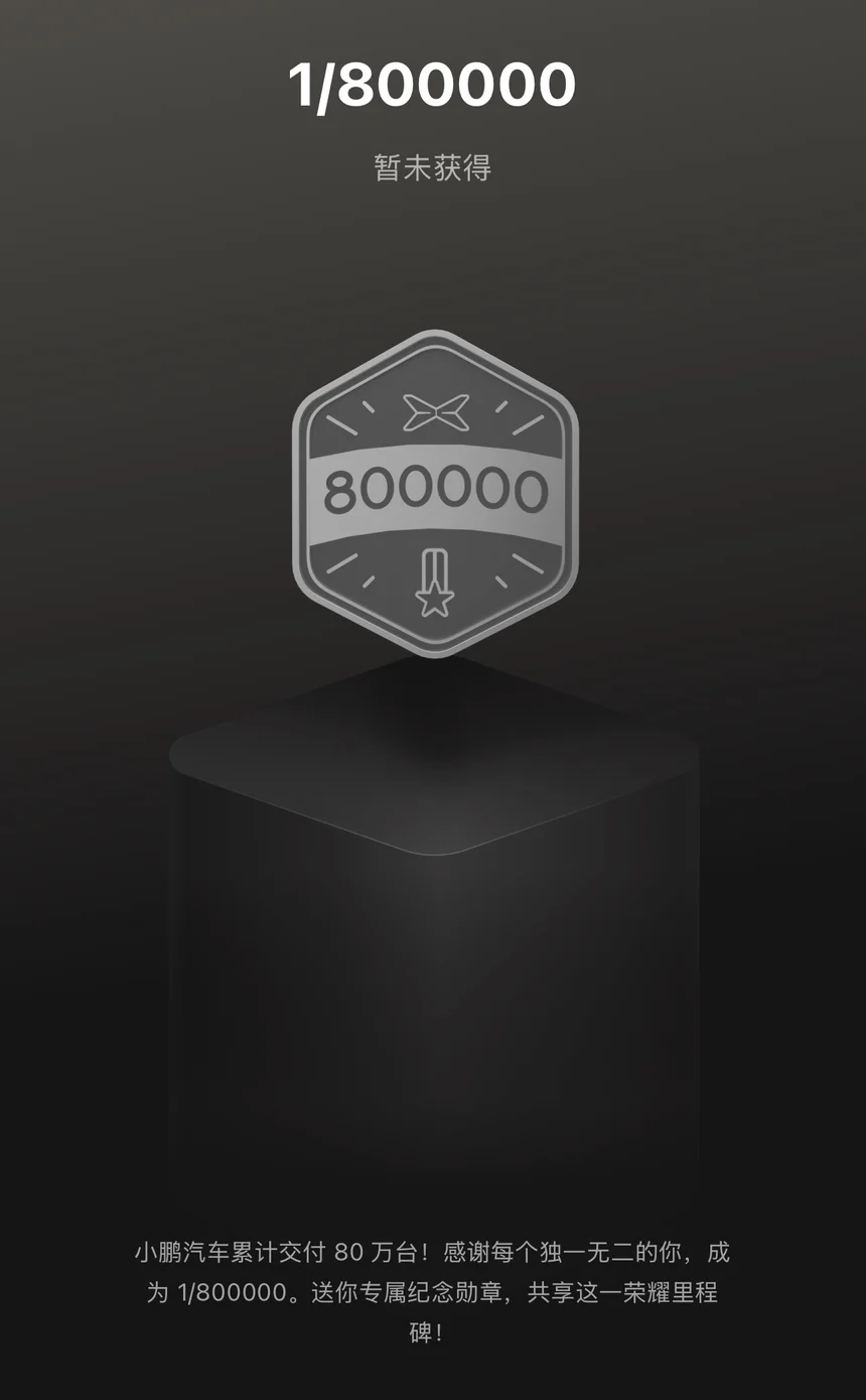 那时还在反复权衡、犹豫观望,没能第一时间入手小鹏。等终于下定决心、提车MONA时,80万交付的专属纪念活动早已落幕。这枚1/800000的勋章,错过的不是一份荣誉,而是曾经犹豫不前的自己…