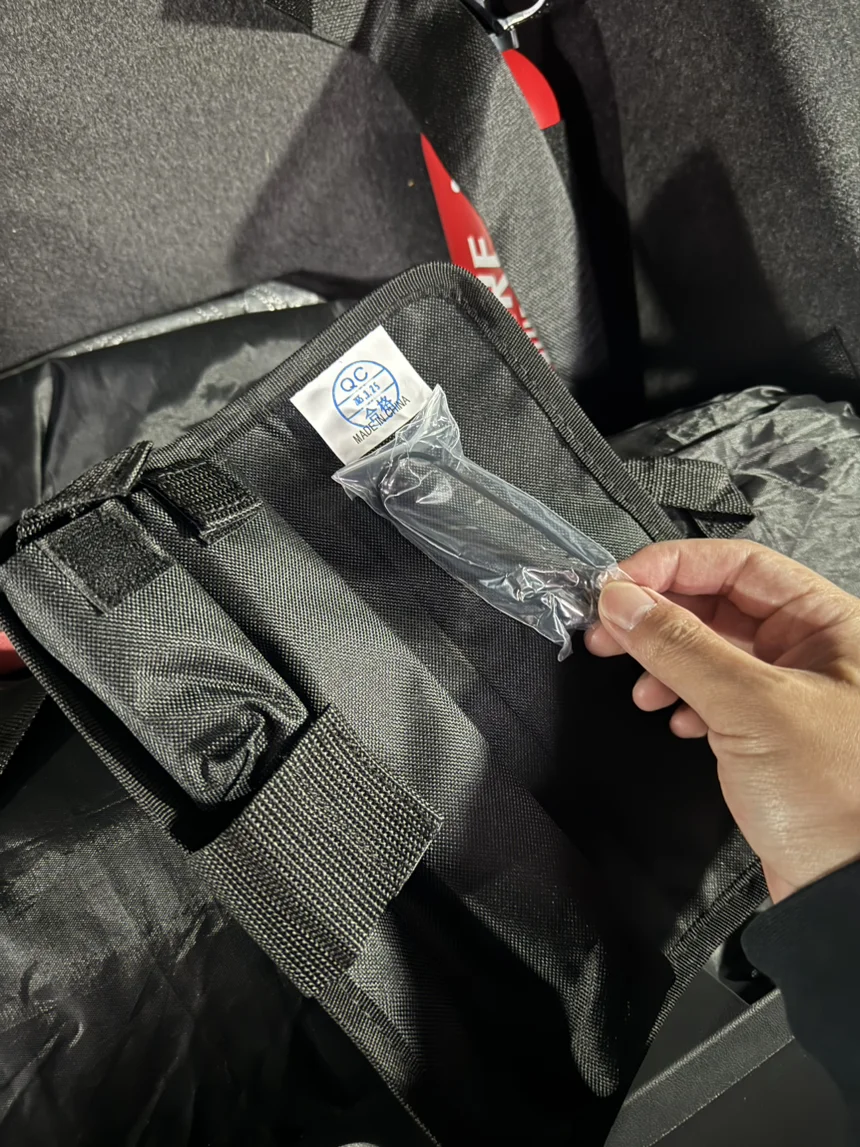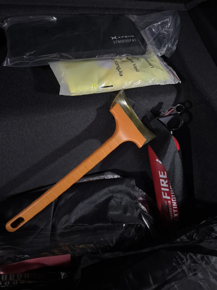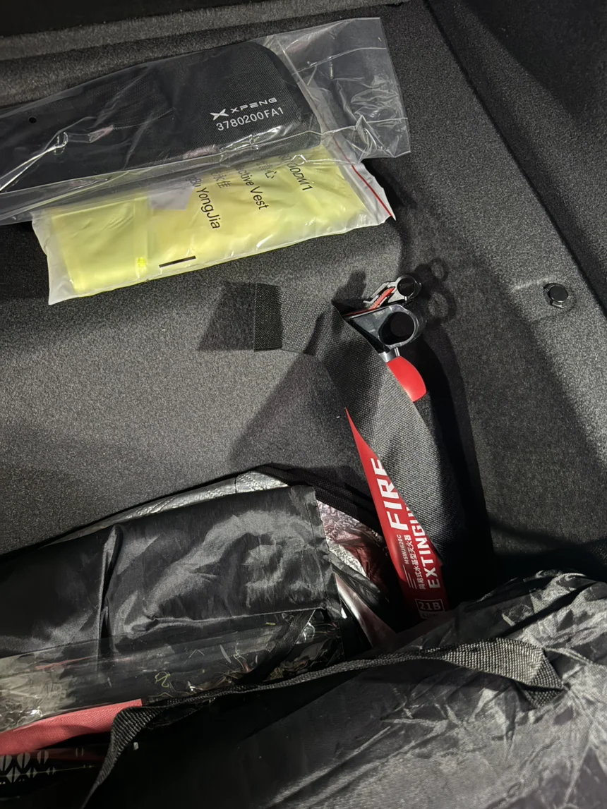 灭火器也能稳妥放下面,拿取方便还不碍事。最贴心的是小鹏还送了车轮螺帽盖夹子,拆螺帽超方便,细节直接拉满。
