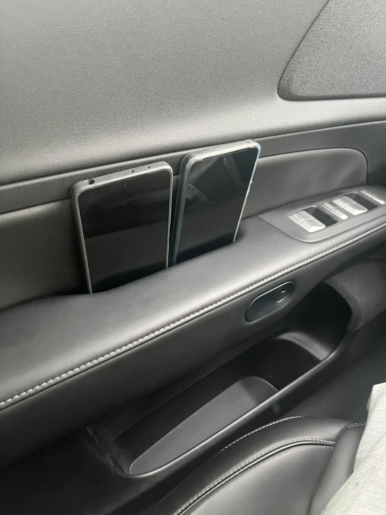 一、车门扶手处的手机收纳设计太贴心了!这里预留了刚好适配手机的凹槽,两部手机能稳稳卡位,不会晃动磕碰。黑色内饰搭配简约线条,质感拉满,放手机、取物都超顺手,细节设计太懂用车需求了。