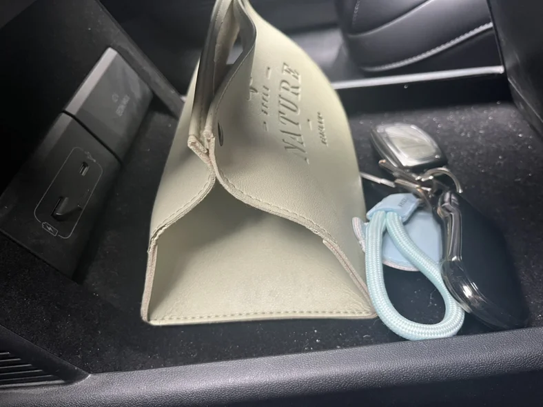 二、中央扶手箱下方,植绒内衬质感拉满。左侧预留了USB/Type-C充电口,方便给小设备补电。餐巾纸盒和车钥匙分区摆放,整洁又不杂乱,随手取放超方便。细节设计把实用和精致拉满,让车内小物件都有专属位置,强迫症狂喜。