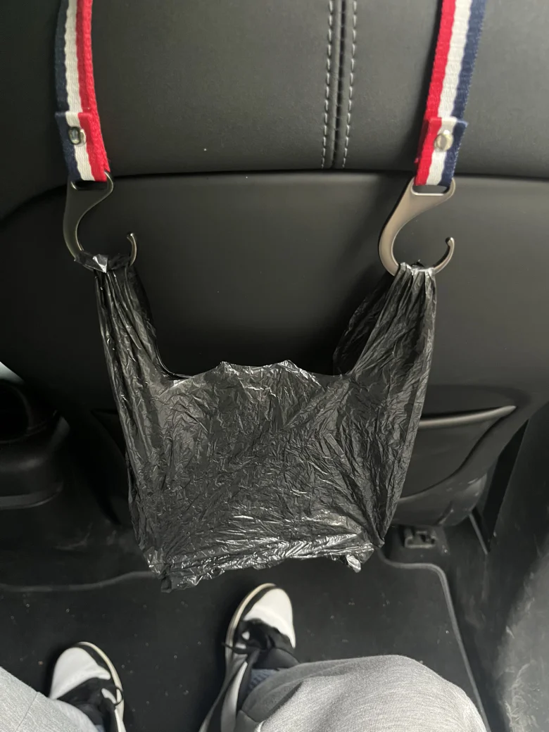 七、座椅靠背购买一个双挂钩简直太实用!挂个垃圾袋秒变车载垃圾桶,后排乘客随手扔垃圾超方便,再也不怕车内脏乱。红白蓝织带挂钩承重力强,垃圾袋挂得稳不晃,用完直接取下丢弃,清洁车内超省心,出行幸福感直接拉满。