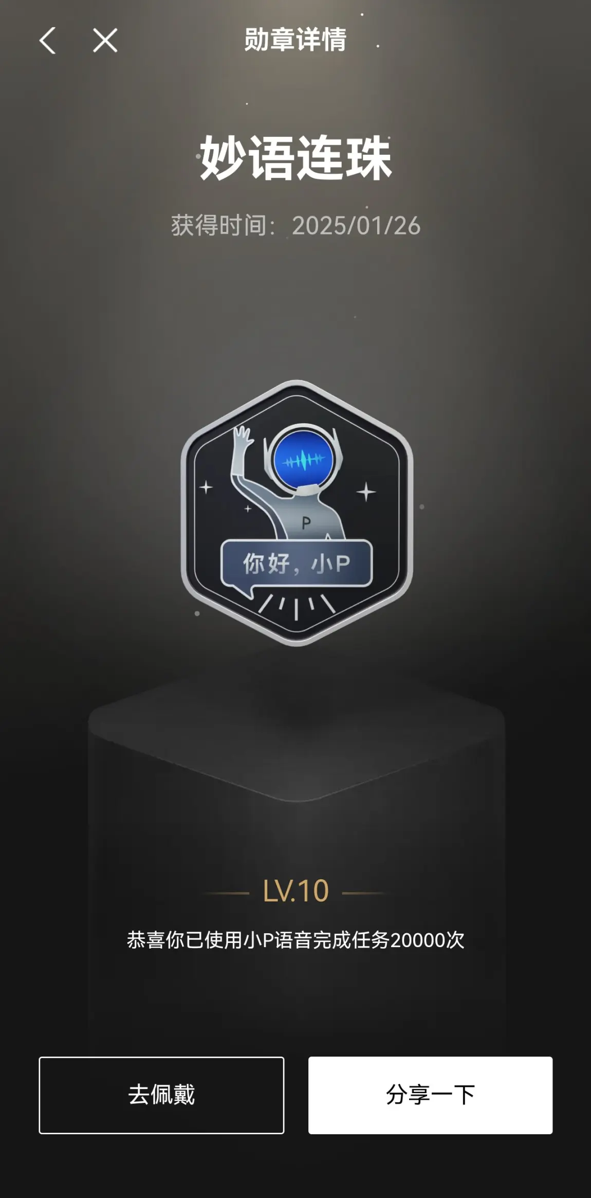 从“你好,小P帮我打开空调”到“帮我打开空调,小P”,小P变得更加的拟人。从“可见即可说的小P”到“AI小P”,小P有了它自己的思想。超过2万次对小P的呼唤,让我拿下了这枚勋章,而这枚勋章也见证了小P成长的历程。