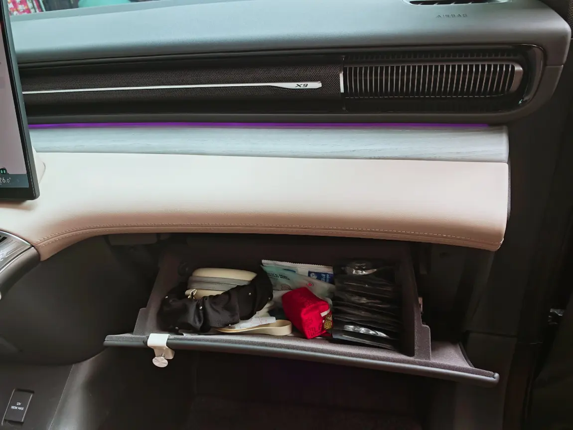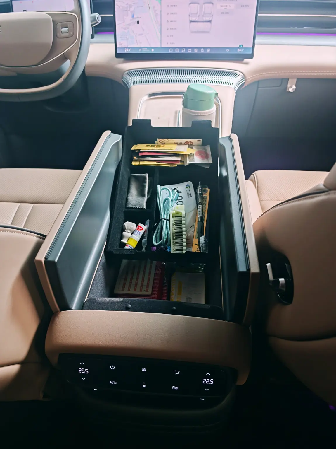 X9的扶手箱纵深空间十分可观,内部空间规整,还能搭配某宝的分层储物盒实现分区收纳,实用性直接翻倍。上层可以放置驾驶证、行驶证、车钥匙、牙线等常用物品,拿取便捷;下层纵深足够,能收纳应急小工具、备用钥匙、红包等不常用的物品。