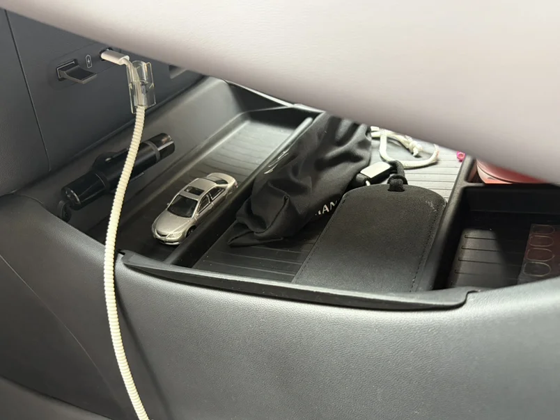 1.中控下方的储物空间,搭配专用储物盒超实用!眼镜、破窗器、充电线、备用车钥匙全都能分门别类放好,再也不用在车里乱翻找,小物件整整齐齐,中控区域看着就清爽。(附带老车的灵魂车模~~)