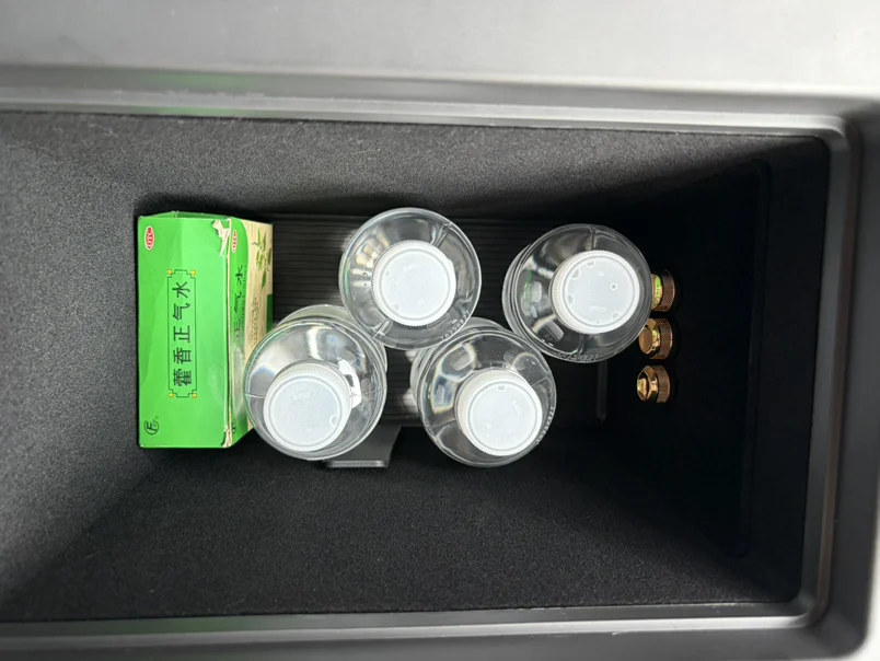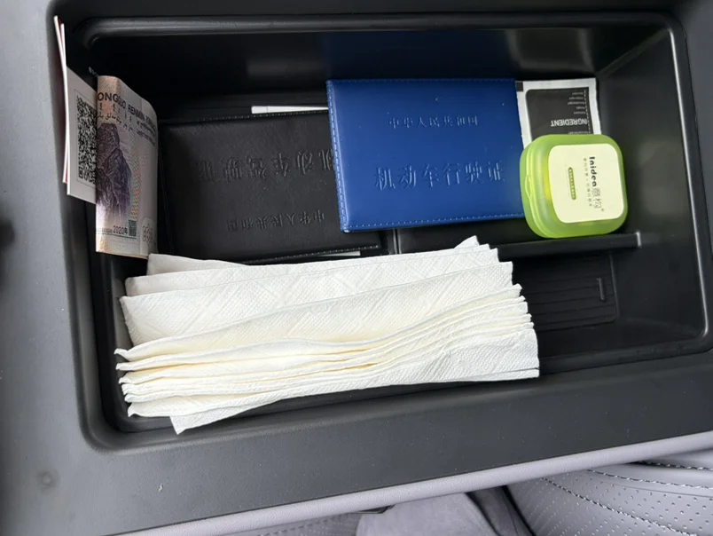 2.中央扶手箱一定要安排专用隔板,分层收纳太香了!上层专门放停车卡、行驶证、驾驶证,常用证件随拿随放,不用再翻箱倒柜;下层空间宽敞,放几瓶矿泉水、常备藿香正气水,自驾通勤应急超方便。