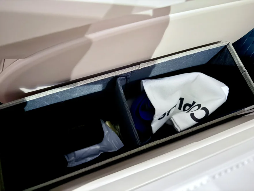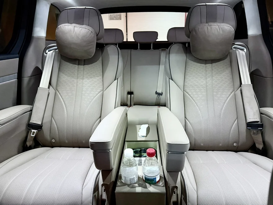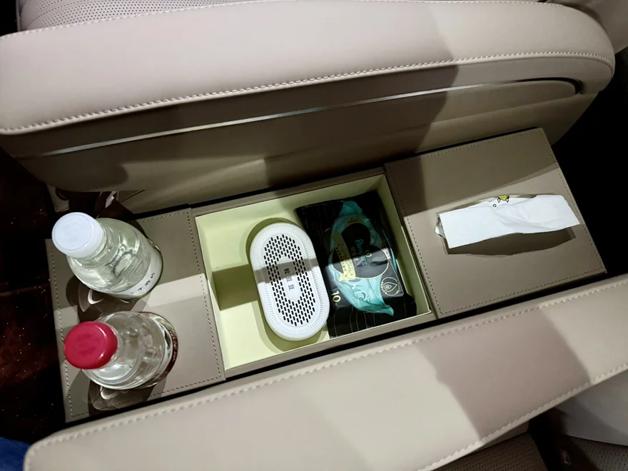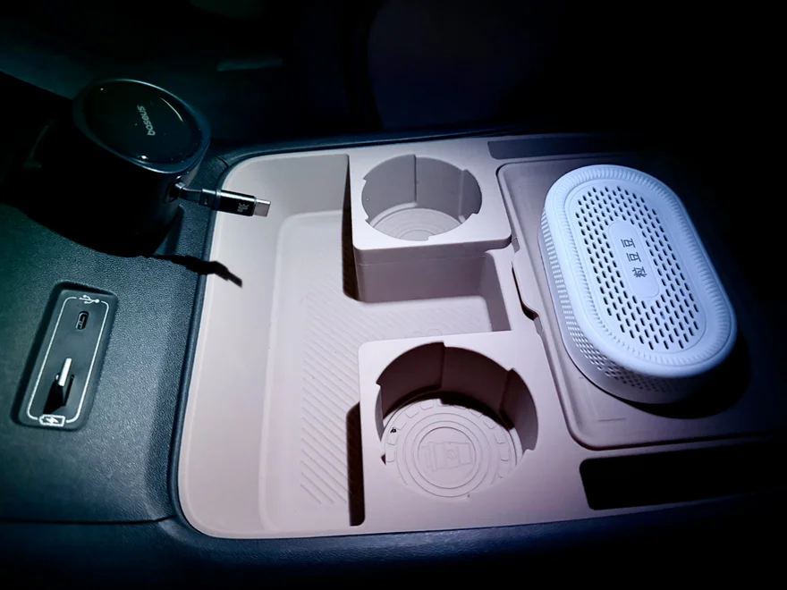1. 二排过道储物盒:日常车内坐4人,不需要走到三排,就可以制备这个物件,如下图,上层可以放水杯,纸巾和零碎物品,下层很深可以放偏大的东西,很方便。如果是7人出行,可以整体挪到后备箱,不影响二排走道。