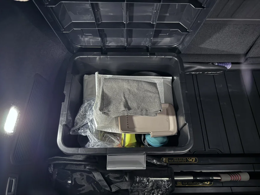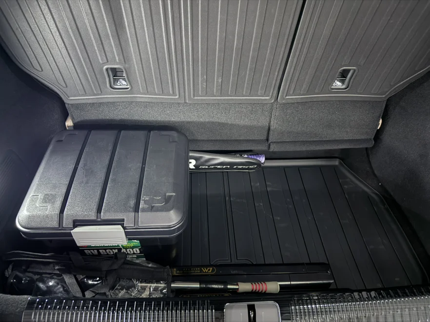 3.后备箱储物盒:很厚实的塑料,防水防雨,可以放蛮多东西,也不会占总太多后备箱空间,折叠的时候直接搬出来就行,很方便,实物见图片。
