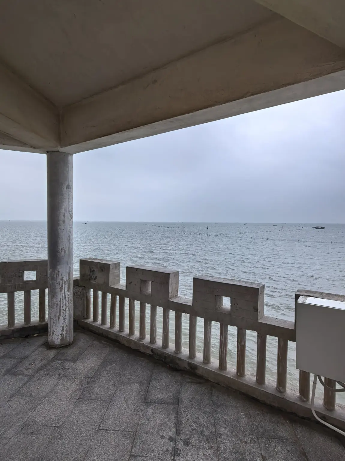 - 亭子建在海上栈道上,三面环海,傍晚时分,夕阳把海面染成金红色,渔船归港,波光粼粼,随手一拍都是大片。