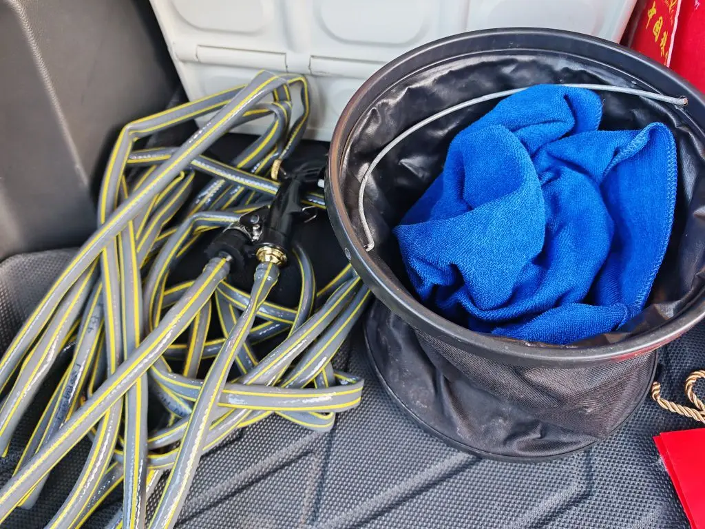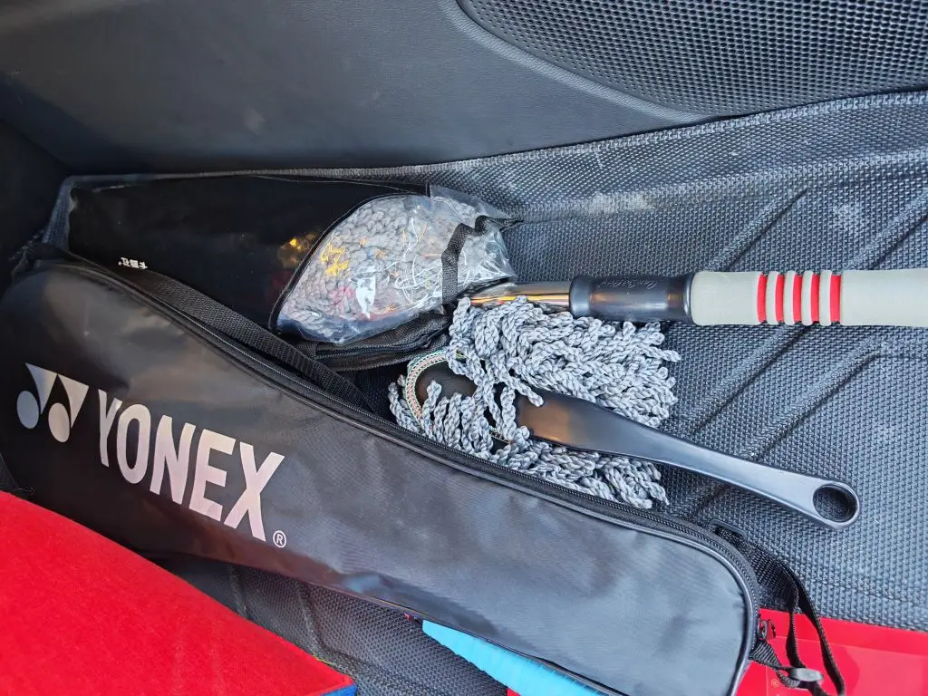 平时后各箱里,常备的有一个小鹏的折叠收纳箱,放些零碎,然后还有洗车的工具,羽毛球拍啥的。