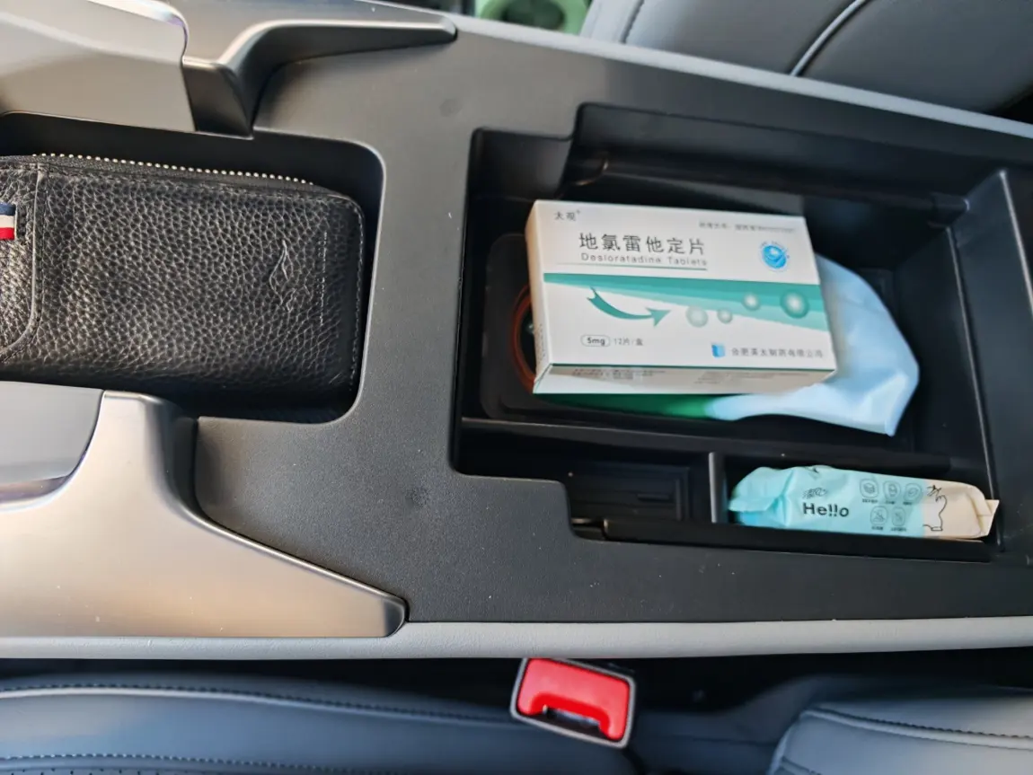 杂七杂八的小东西我基本上都放在这,因为深度特别深,我给隔了两层,我的各种车内的支架啥的都放在这,还有平时用的过敏药屏幕擦拭布啥的,对了充电口位置放我钥匙包刚刚好。