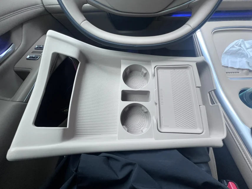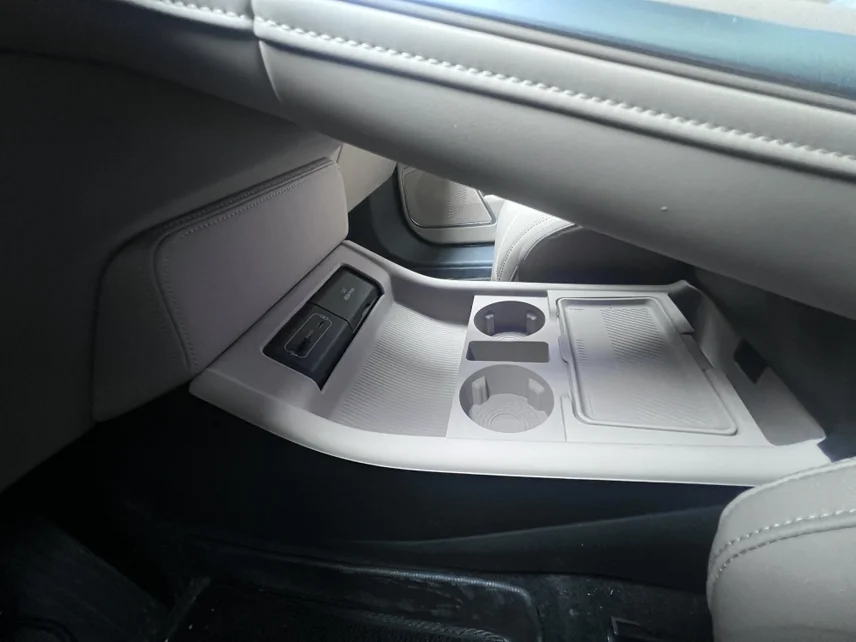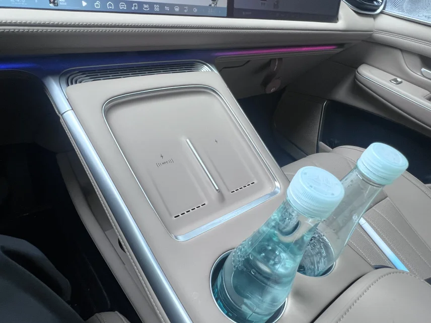 • 上层无线充电区:双无线充电板,两部手机同时快充,旁边原生杯架深挖设计,大水杯、奶茶杯都稳当,急刹车也不洒
