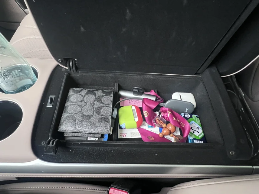 • 分层收纳盒:加装专属分层盒后,把中控储物区彻底分区,湿纸巾、票据、水杯各归其位,拿取一目了然
