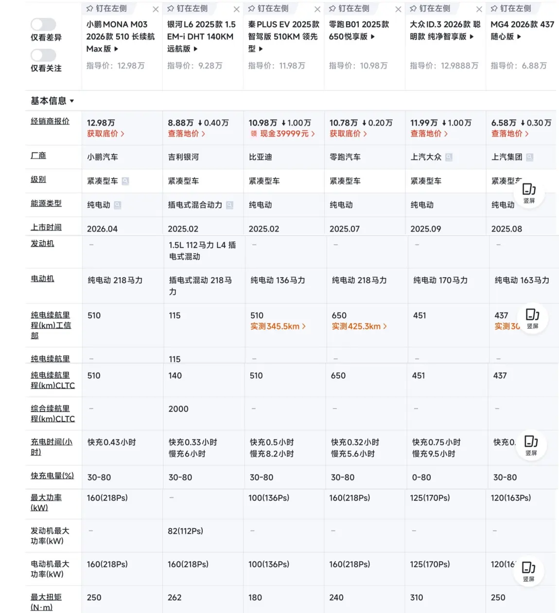 对比银河L6、秦PLUS EV、零跑B01、大众ID.3、MG4等车型,小鹏MONA M03优势突出。纯电218马力动力充沛,510km续航满足通勤,0.43小时快充高效。12.98万指导价,智能配置拉满,空间与实用性兼顾。对比插混的银河L6,纯电体验更平顺;对比零跑B01,品牌与智驾更成熟;对比大众ID.3、MG4,性价比与智能化全面领先。综合动力、续航、智能、价格,最终选择小鹏M03,是12万级纯电家用的最优解。