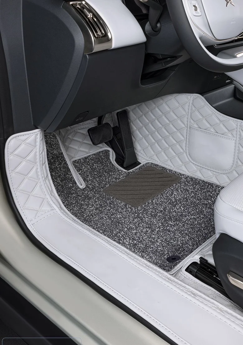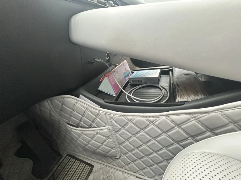 我的是紫白,为了好看,买了一套白色的全包围地垫。可以看到中控下方,全包围地垫上自带了一个小口袋。我平常会将常用证件放在这里,有需要时就可以直接取用,很方便。PS:白色好看是好看,但真的好容易脏啊。。。😭