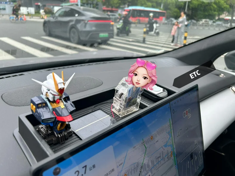 这是我最喜欢的一个。右侧放ETC,不会乱跑,还能随时太阳能充电。大格子放了两个材料,一个是高达胸像,另一个是那我老婆照片做的摇头玩具,然后自己改成太阳能的,每天开车看她对我仰头晃脑,坏心情一下就没有了😘