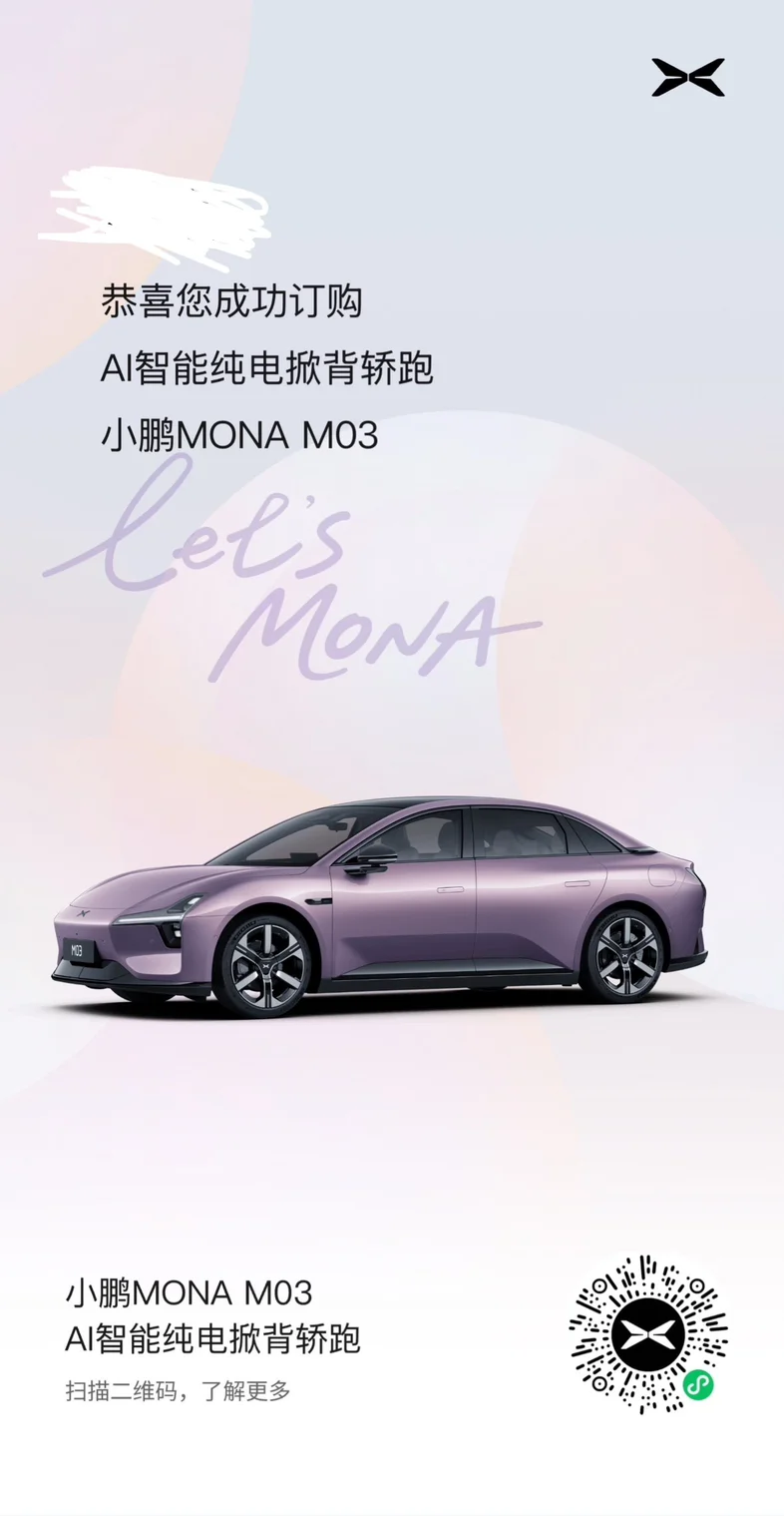 #小鹏MONA M03# 一开始只是刷到小鹏的机器人高度拟人化,惊叹科技的发展已经如此之快,同时在看车的过程中又看到很多和我一样25到30岁的同龄人都选择了小鹏mona3这款车型,感叹于到底是何种魅力让这么多人心甘情愿为她花钱,直到自己抱着试一试的心态走进了小鹏4s店,流线型的车型,温柔又不扎眼的紫色,掀背造型带来超大的储物空间,都让我一下子爱上了这款车,紧接着随着店员带我试驾,仿佛打开了新世界的大门,2025款的智能驾驶已经完备到了这个程度!只需要盯着路况,不需要聚精会神,它就帮我搞定了一切。但是当时年底资金紧张就没有急于买车,这样一拖就来到了2026年3月,得知mona03新款即将上市,又再一次去4s店试驾并了解新配置,相比于外观颜色的更新,内饰的细节处让我更加惊喜,座椅按摩体验比小米的还舒服,智能驾驶也比同价位的深蓝更聪明,当即决定,就是它了!于是在4月2日守着大师兄的直播,定下了甘肃省的第一台mona03,虽然因为物流原因到今天还没有提车,但是陆续看到车友群里大家的好评,我就知道自己的选择是正确的!