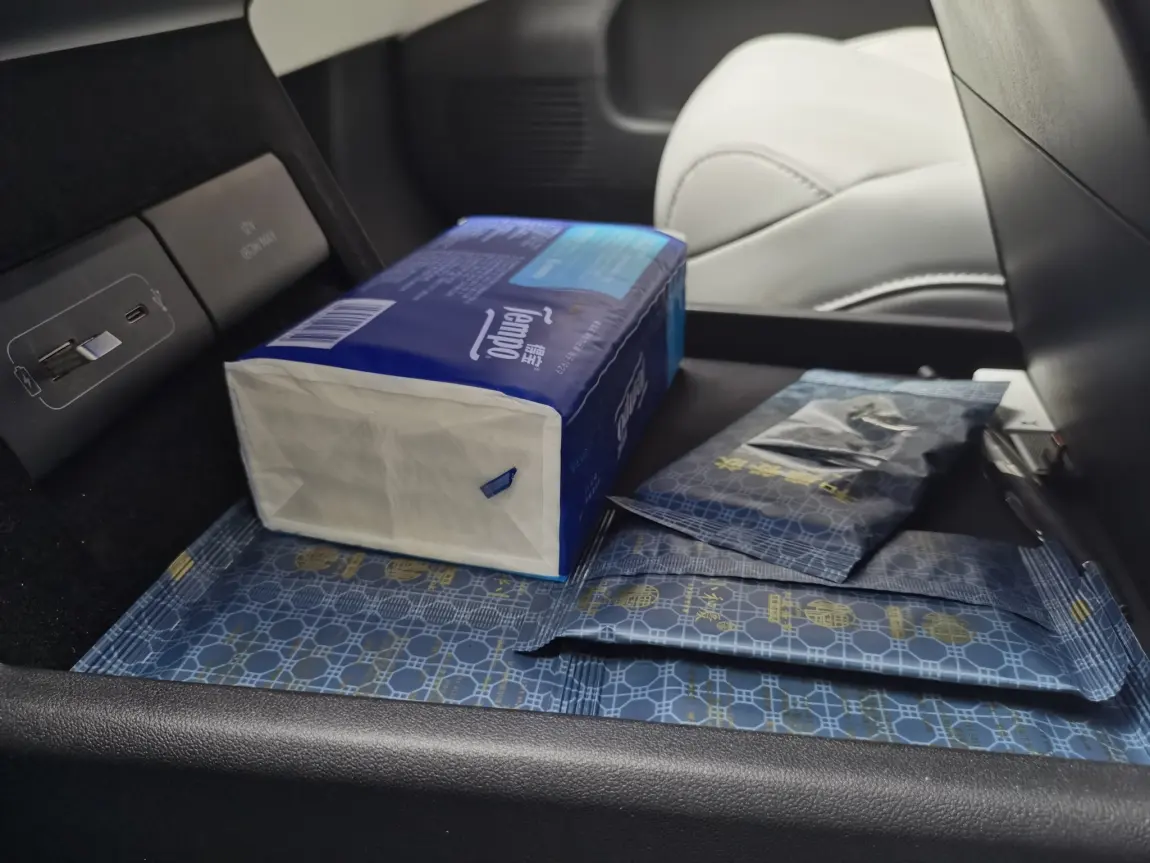 第二个宝藏空间,在无线充电板的下方,是G6最隐蔽的储物格之一。这个空间在中控下方,从无线充盖板向下就能看到,深度和宽度都很可观,我平时就把得宝抽纸整包放在这里,完全不突兀,也不会挡住无线充电。除了纸巾,还能放口罩、湿纸巾、车载香片这类日常用品,相当于给中控多了一个「隐形抽屉」。