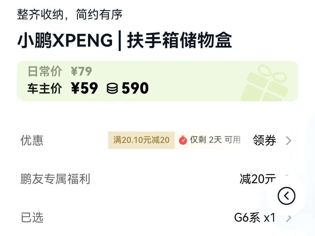 我的解决办法很简单:在小鹏商城花59元,入手一个G6专用的扶手箱储物隔层架。这个隔层架完美适配G6扶手箱的尺寸,装上之后,直接把扶手箱分成上下两层: