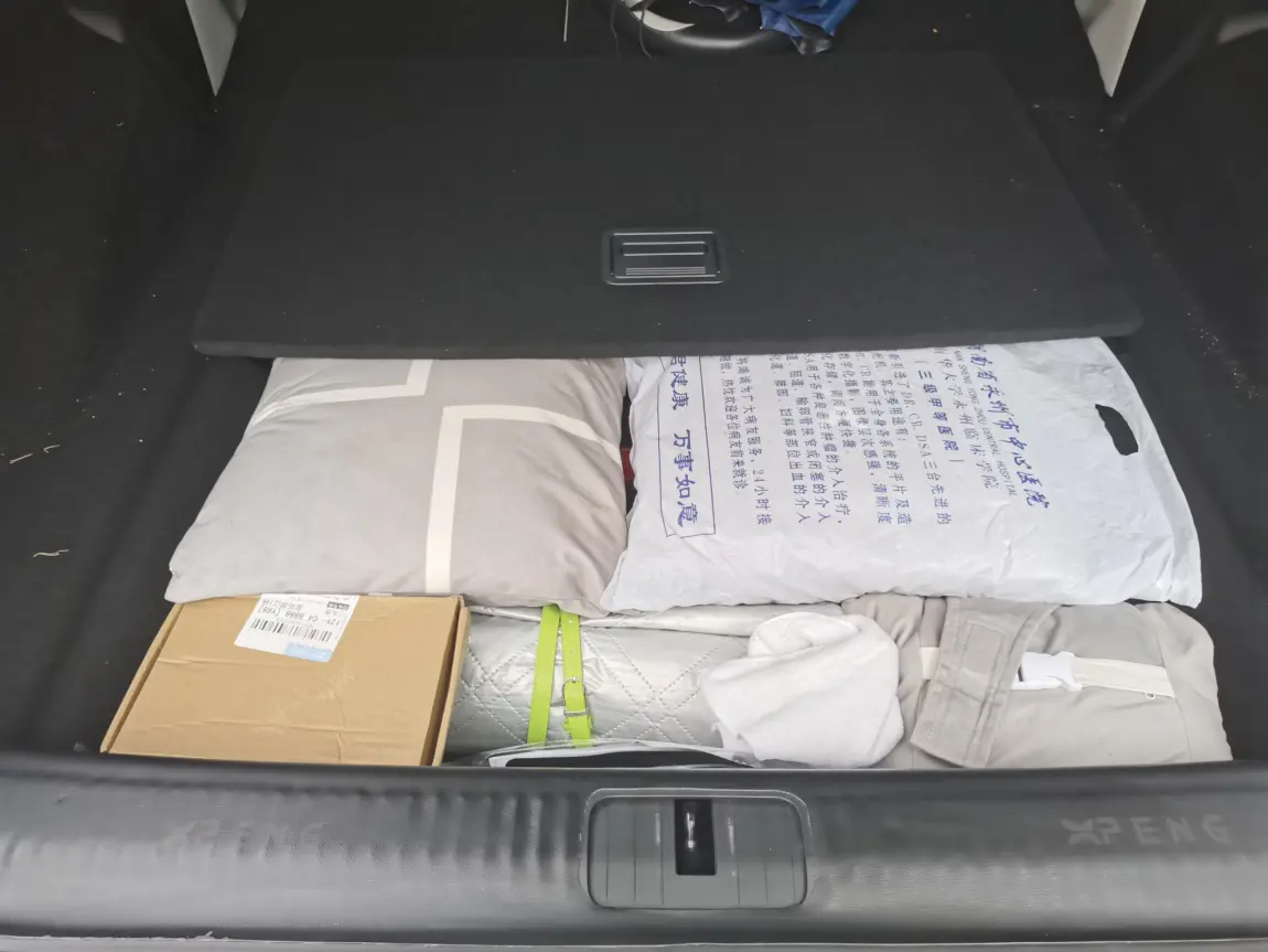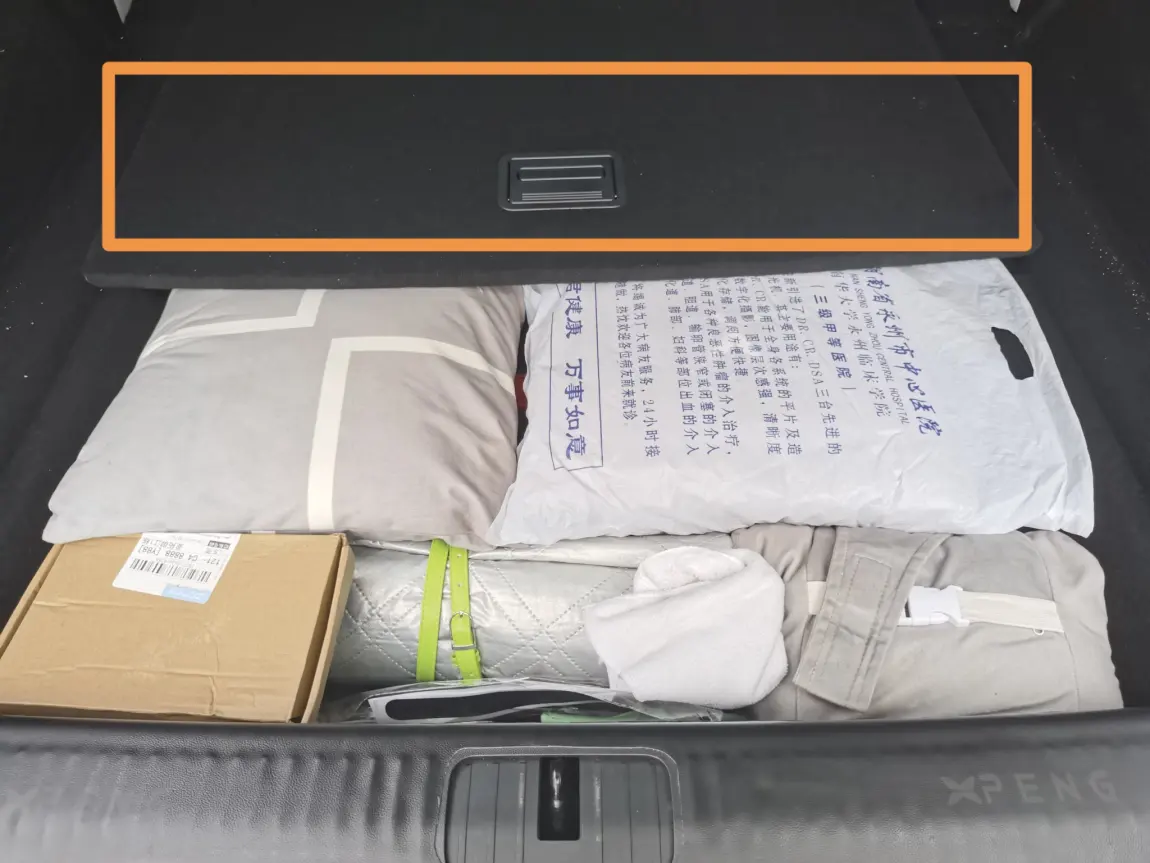 接下来到车尾,第一个实用空间,就是尾箱的主底层。G6的尾箱有一个可抬起的盖板,掀开之后,下面是一个超大的平整空间,我平时就把车载抱枕、床垫、露营垫这类常用的大件物品放在这里。这个空间高度足够,放两个抱枕加一个床垫完全没问题,而且盖板一抬就能拿取,不用把尾箱的东西全部搬出来,日常使用超级方便。