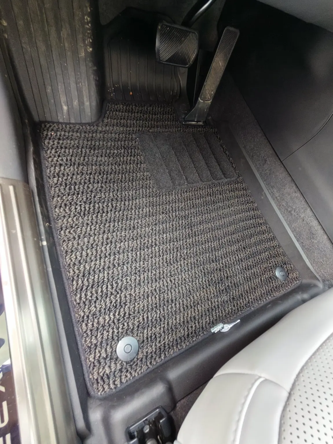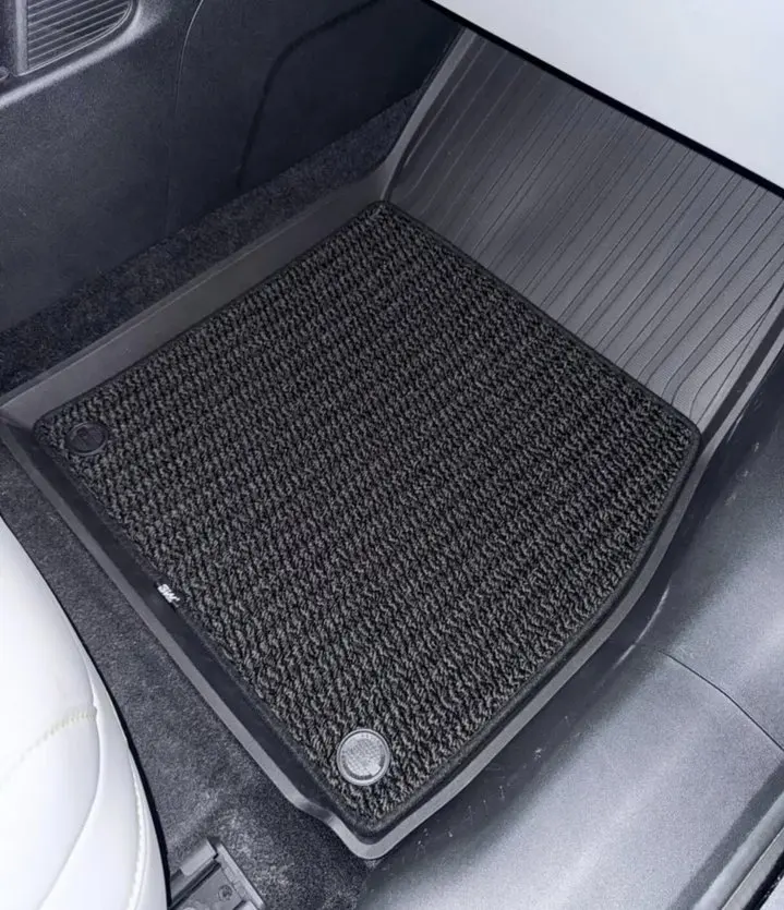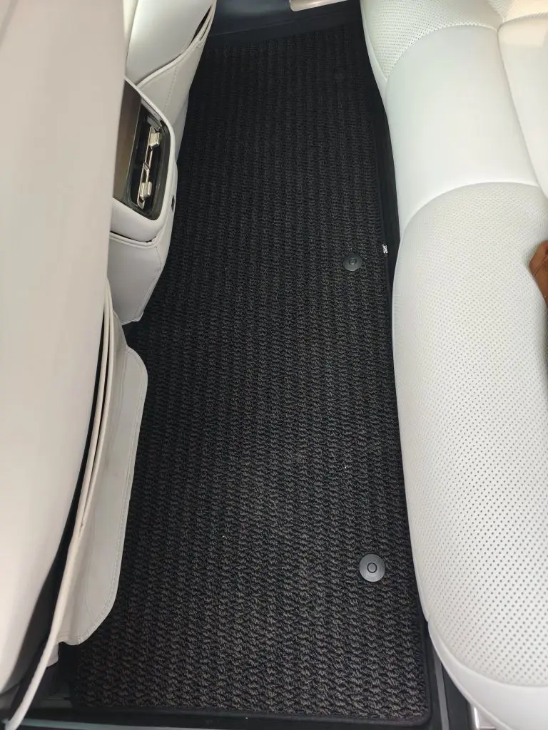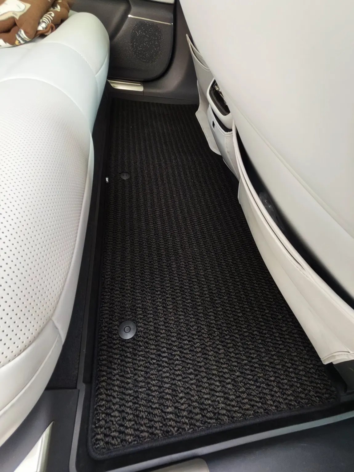 原厂开模的贴合度真的没话说,严丝合缝不翘边,主驾位完全不卡油门刹车,安全感拉满。美尼斯毯面脚感软糯,和车内白内饰适配度满分,平时带的泥沙、零食碎屑,吸尘器一吸就干净,防水防污还好打理,后排全平设计,坐人也不硌脚,完全没有廉价脚垫的异响问题。