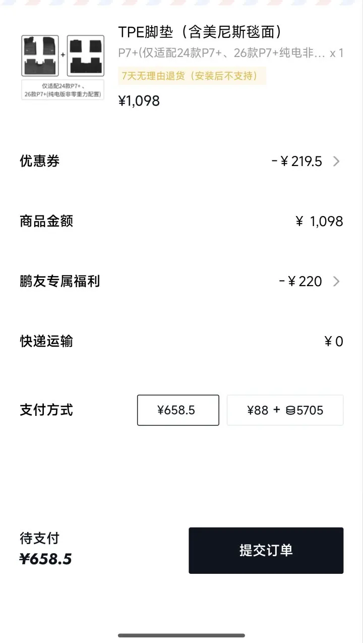 24款P7+车主来真实分享!之前692元入手了这款原厂TPE脚垫,用了快半个月越用越香,今天刷小鹏商城看到现在价格更香了只需要658.5元,虽然没法退差价,但真心觉得早买早享受,现在入手的鹏友直接血赚,要是能退差价,那就是更好啦!
